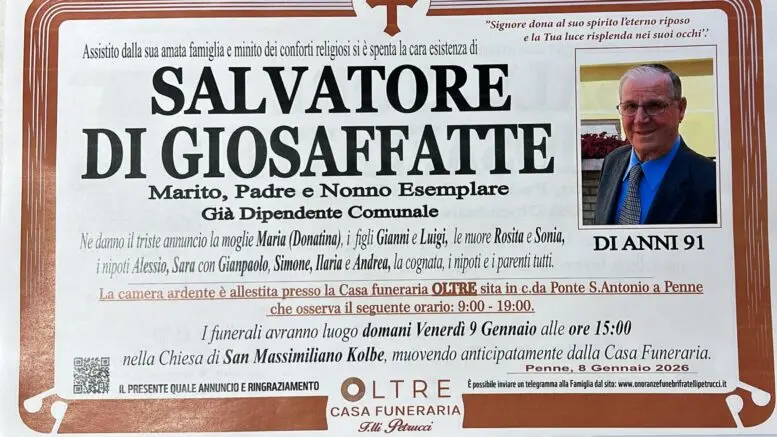 PENNE. Lutto a Penne per la morte Salvatore Di Giosaffatte: era il papà di Luigi, direttore generale di Confindustria Abruzzo Medio Adriatico. Di Giosaffatte, 91 anni, è stato dipendente comunale. “Marito, padre e nonno esemplare”, come si legge nel manifesto funebre.