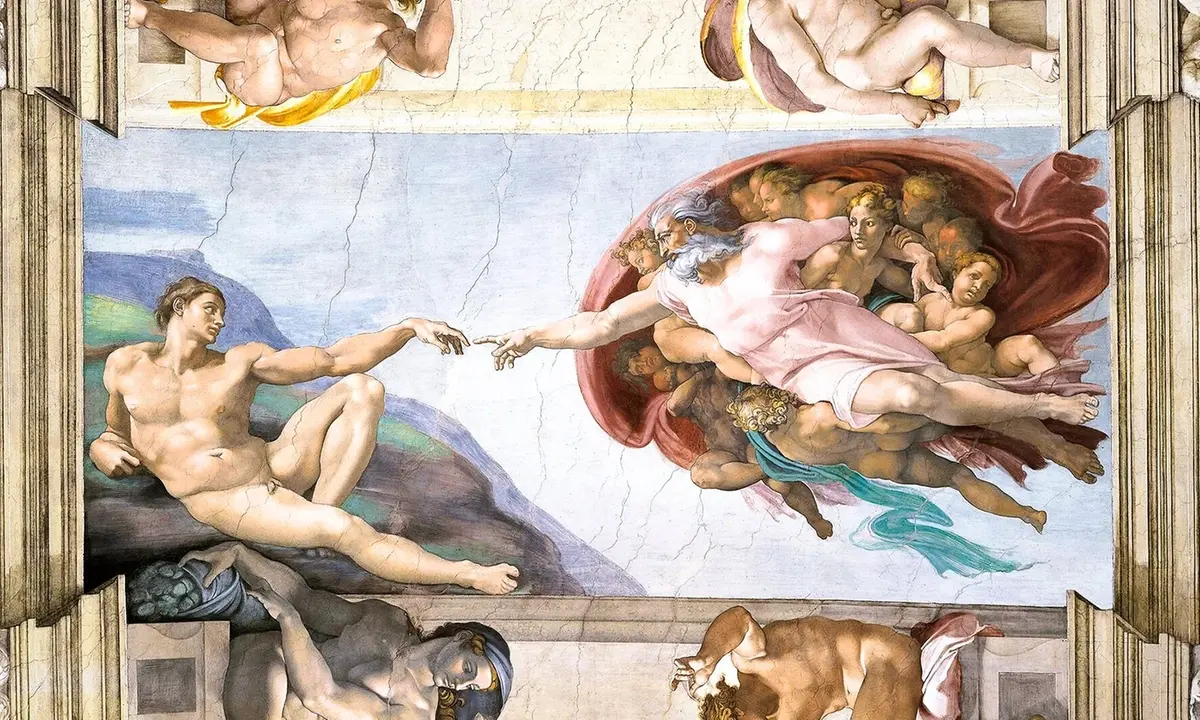 Ovviamente la Creazione di Adamo, dell’anno precedente, 1511, era il pezzo forte. Tra le storielle esistenti in circolazione vi sarà anche quella del doppio lavoro di Michelangelo. Ovvero l’ipotesi, non veritiera, secondo la quale, passata la fase di attenta disamina e di celebrazione della cura posta nell’esecuzione dell’opera, Michelangelo sarà costretto a fare delle variazioni. Aveva, infatti, disegnato l’arrivo del primo uomo con le dita di Dio e di Adamo che, invece di sfiorarsi, si congiungevano: per ricevere il tocco vitale. Anche se nelle Sacre scritture il riferimento fosse al soffio dell’esistenza e non al tocco. La congiunzione fisica non sarebbe dovuto essere sempre possibile, a prescindere.