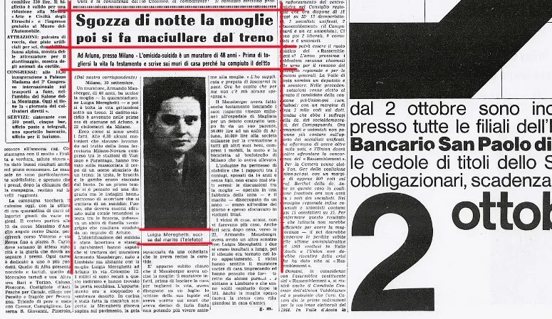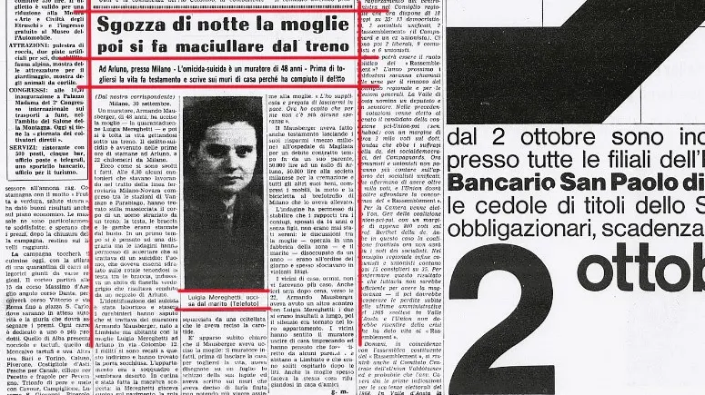 Oggi, ma nel 1967, ad Arluno, in provincia di Milano, veniva identificato dai carabinieri, mediante l’etichetta del vestito di fustagno verde indossato dalla vittima, il corpo mutilato del muratore Armando Mausberger, di 48 anni, che la notte precedente, 30 settembre, aveva ucciso la moglie Maria Luisa Mereghetti, di 42 anni, sgozzandola con un coltello da cucina, poi l’aveva fatta finita sdraiandosi sui binari del treno Milano-Torino che, transitando, lo aveva decapitato e gli aveva reciso gli arti. Mausberger, originario di Limbiate, in quel di Monza, disoccupato da un anno, ma anche invalido del lavoro per via della mutilazione ad un occhio che comunque gli assicurava una pensione, era sposato da 14 anni e non aveva figli.