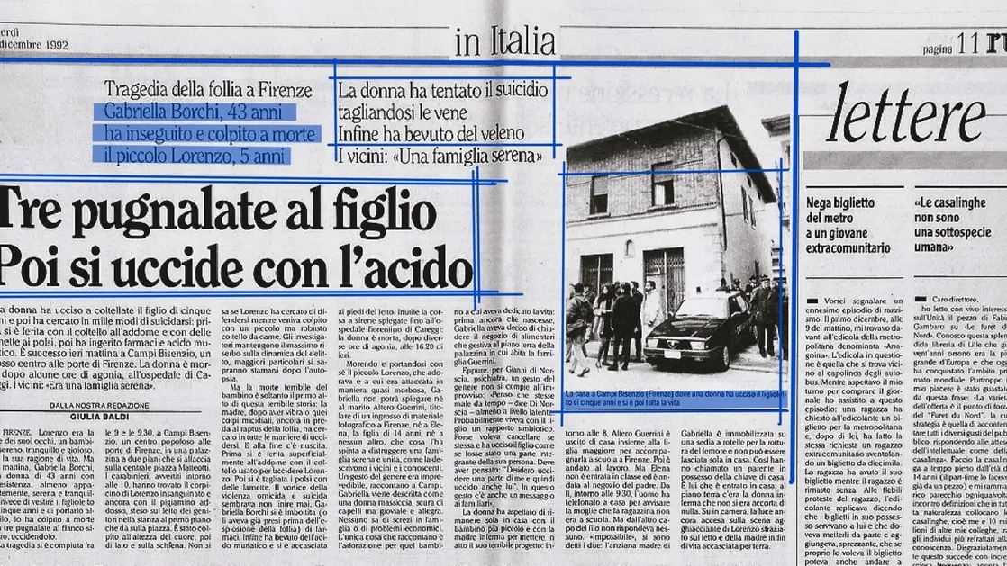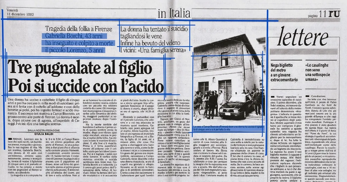 Oggi, ma nel 1992, a Campi Bisenzio, in provincia di Firenze, alle 9, nella sua abitazione, nella centrale piazza Giacomo Matteotti, Gabriella Borchi, di 43 anni, verosimilmente in preda a raptus di follia, uccideva con tre coltellate il figlio Lorenzo Guerrini, di 5, poi si suicidava tagliandosi le vene con una lametta, ingerendo un ingente quantitativo di barbiturici e bevendo acido muriatico. I fendenti letali al piccolo Lorenzo erano assestati al torace, al fianco, alla schiena. Il primo colpo, con un coltello da cucina, glielo infliggeva mentre dormiva. La donna aveva anche cercato, non riuscendoci, di pugnalarsi all’addome. Lasciava il marito, Altero Guerrini, titolare di un negozio di materiale fotografico nel capoluogo toscano, e la figlia Elena, di 14 anni. Gabriella Borchi aveva avuto una rivendita di generi alimentari sotto casa, ma l’aveva chiusa, quando stava per partorire Lorenzo, per dedicarsi a lui a tempo pieno. Nell’alloggio c’era anche la madre di lei, Derna, ottuagenaria, che era immobilizzata dal luglio scorso sulla sedia a rotelle a causa della frattura del femore. Ad allarmarsi era stato per primo Altero Guerrini, che aveva telefonato alle 9.30 per spiegare alla moglie che Elena non fosse entrata a scuola per via dello sciopero e che quindi fosse rimasta con lui in bottega, ma non aveva avuto risposta dall'altro lato della cornetta dopo molti squilli andati a vuoto. La Borchi veniva rinvenuta, da una parente allertata dal marito che era residente a poca distanza e in possesso delle chiavi della palazzina, ancora in vita, benché rantolante. Veniva trasportata nell’ospedale di Careggi in coma e spirerà alle 17 dopo l’intervento chirurgico che verrà tentato come rimedio estremo. Il fatto di sangue, comunque, destava enorme clamore (nella foto, particolare, la notizia riportata dal quotidiano comunista “l’Unità”, nell’edizione del giorno successivo, 11 dicembre 1992) non solo nel circondario. Anche per la particolare efferatezza dell’esecuzione. Apparentemente quella dei coniugi Guerrini, con i loro eredi, sembrava un’esistenza tranquilla, persino affiatata. Senza particolari problemi economici. Almeno stando al resoconto dei vicini e dei conoscenti. Lei, pur manifestando un attaccamento morboso al bambino, anche quando doveva portarlo nell'asilo gestito dalle suore, non aveva dato precedenti segni d’instabilità emotiva. Né avvisaglie di depressione, tantomeno di squilibrio mentale. Evidentemente la situazione non era così. Dal punto di vista della risonanza mediatica, con la copertura televisiva molto accentuata anche durante il tortuoso iter processuale, su tutti il più tristemente celebre dei casi analoghi sarà quello che si verificherà a Montroz di Cogne, in quel di Aosta, il 30 gennaio 2002. Ovvero quello che annovererà Annamaria Franzoni quale supposta assassina del figlioletto Samuele Lorenzi, di 3 anni, apparentemente senza una spiegazione logica. E che le farà rimediare la condanna, in via definitiva dopo il passaggio in Corte di cassazione, del 21 maggio 2008, a 16 anni di reclusione. Pena che poi verrà ridotta sensibilmente per indulto e per buona condotta. Infatti il 7 febbraio 2019 verrà diffusa dagli organi d'informazione la notizia dell'avvenuta scarcerazione anzitempo della Franzoni.