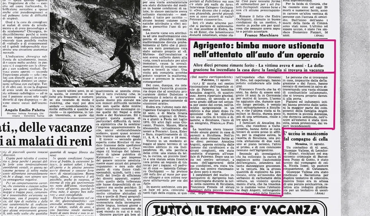 Oggi, ma nel 1976, a Siculiana, in provincia di Agrigento, l’incendio provocato dall’autobomba verosimilmente destinata ad assassinare Francesco Frenda, di 45 anni, operaio emigrato in Germania 16 anni prima e tornato per le ferie, uccideva Annalisa Angotti, di 4 anni, di Caltanissetta, e la madre Carmela Milazzo, di 38, che erano in villeggiatura nella casa vacanze adiacente la Ford 2000, con targa tedesca, imbottita di tritolo e parcheggiata proprio davanti la porta dell’abitazione. Appartamento che era accanto a quello del presunto bersaglio dei malavitosi. La bambina, che aveva il 70 per cento del corpo ricoperto di ustioni di secondo e di terzo grado, moriva pure a causa della lunga e tortuosa corsa in ambulanza verso l’ospedale di Palermo messa in atto nel tentativo di salvarla. Alla fine spirava nel centro di rianimazione. Il padre di Annalisa, Ugo Angotti, e i fratellini della malcapitata, Francesca di 16, Raffaella di 13, Renato di 9, invece, riuscivano a salvarsi. Mentre nell’esplosione rimanevano ferite altre dieci persone. Le fiamme lambivano anche la dimora adiacente occupata da Mario Bruno e la moglie Virgilia Pantano, di 37 e 38 anni, che avevano pure la nipotina, Giuseppina La Novara, di 11, al seguito. Ovviamente il fatto di sangue (nella foto, particolare, la notizia riportata sul quotidiano torinese “La Stampa”, nell’edizione del 12 agosto di quel 1976) destava enorme scalpore anche al di fuori della Sicilia, sia per la modalità del duplice omicidio avvenuto “per errore”, che per la giovane età delle vittime. Per la precisione Carmela non passava a miglior vita subito, ma il 16 agosto successivo, sempre nel nosocomio del capoluogo regionale, per le conseguenze riportate. Frenda era arrivato da due giorni e il suo precedente soggiorno nella cittadina Chiaramontana risaliva a tre anni addietro. Con buona probabilità l’attentato era stato ordito dalla malavita locale per punire l'emigrante Frenda: la vendetta per vecchie frizioni, evidentemente non ancora sopite