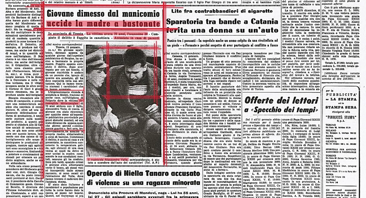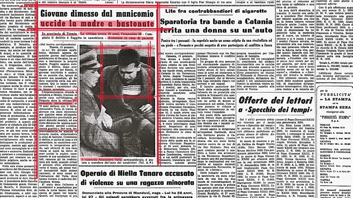 Oggi, ma nel 1968, a Molini, frazione alpestre di Folgaria, in quel di Trento, all’alba, Alessandro Valle, contadino di 30 anni, con trascorsi nell’ospedale psichiatrico provinciale di Pergine Valsugana, veniva catturato dai carabinieri dopo il matricidio della sera precedente. Veniva sorpreso rannicchiato nella legnaia dello zio acquisito Giuseppe Valle, semiassiderato e in evidente stato confusionale, dopo la nottata di fuga nei boschi innevati trascorsa scalzo, in mutande e canottiera, a -14 gradi, dopo il delitto commesso, sopraffatto dal raptus di follia, della madre Ermenegilda Mittempergher, di 70, vedova e pensionata, eliminata a randellate e a colpi d’attizzatoio per il camino sferrati al volto.