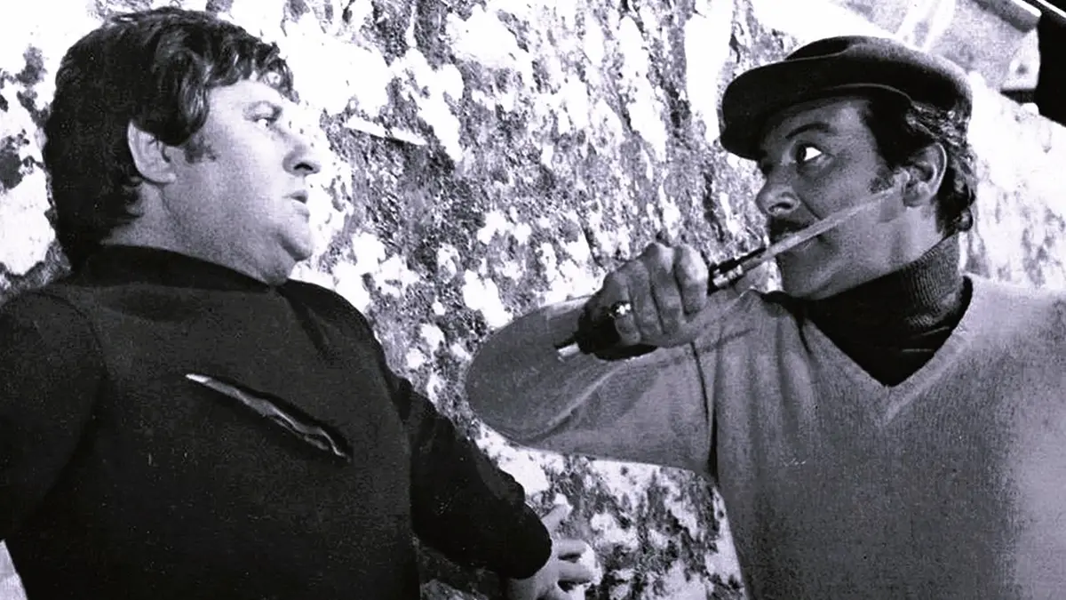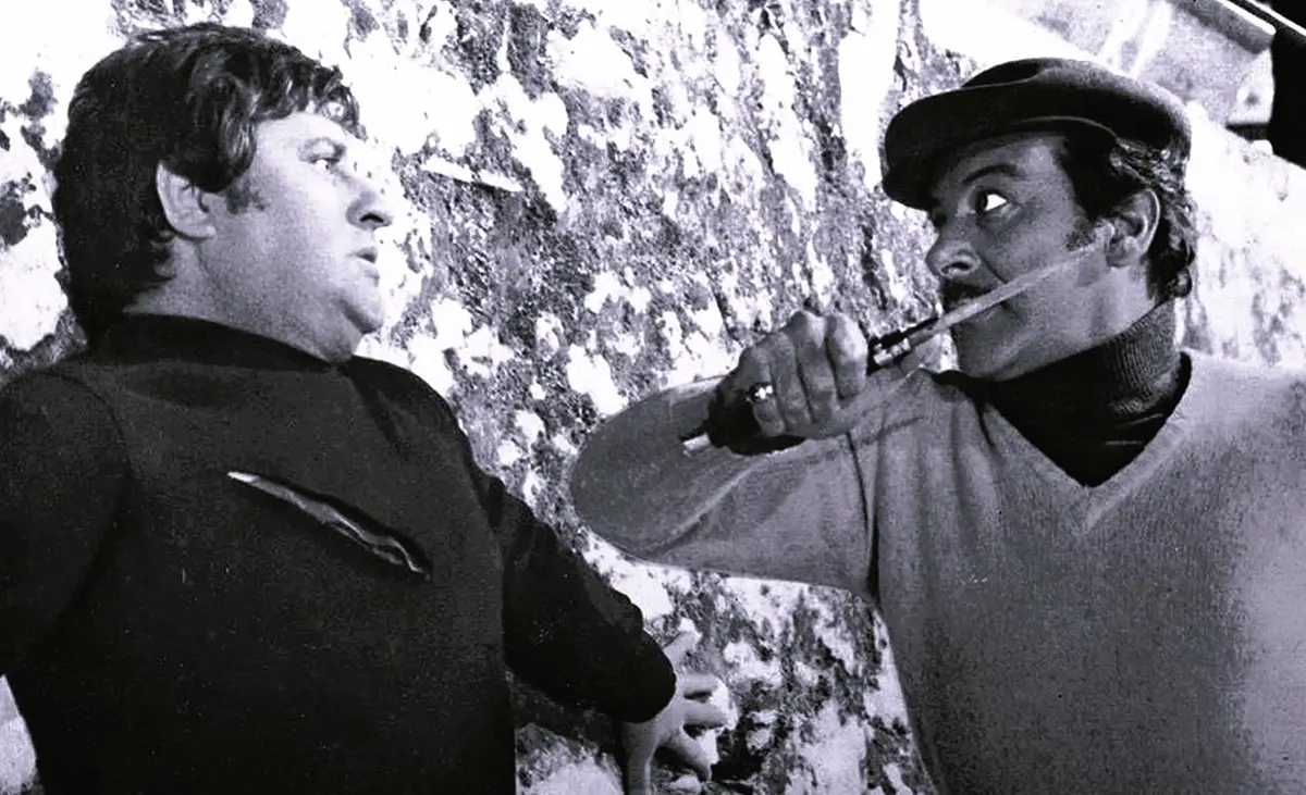 Poi non si era fatto mancare esperienze da conduttore tv, come per Fantastico Enrico, con Montesano, e Fantastico 13, ovvero l’ultima edizione del varietà andato in onda la prima volta il 6 ottobre 1979, su Rai uno, dal 4 ottobre 1997 al 6 gennaio 1998. Merola, (nella foto, particolare, con Giuseppe “Geppino” Anatrelli -che sarà poi conosciuto soprattutto per lo spocchioso personaggio del geometra Calboni interpretato nei primi tre Fantozzi, del 1975, 1976 e 1980- in una scena di culto del lungometraggio “Sgarro alla camorra”, quello del suo debutto, poliziesco “napulegno” del 1973, diretto da Ettore Maria Fizzarotti, alla sua ultima regia cinematografica, nel quale oltre a recitare, nel ruolo di Andrea Staiano, intonava tutti i 5 pezzi previsti nella colonna sonora, cioè: “A camorra”, “Giuramento”, “Cielo e mare”, “O meglio amico”, “Curtiello cu curtiello”) aveva avuto un percorso professionale caratterizzato da due principali intoppi giudiziari, dai quali comunque era uscito a testa alta, senza conseguenze penali.