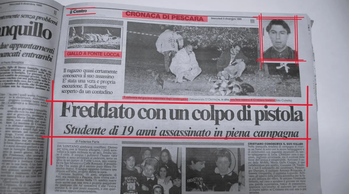 Oggi, ma nel 1996, a Pescara, dopo 40 giorni dall’omicidio di Cristiano Scaletta, di 19 anni, tranquillo studente universitario della facoltà di Economia e commercio dell’ateneo “Gabriele d’Annunzio”, avvenuto il 5 dicembre 1995, in strada Fonte Locca, a San Silvestro, con un colpo di calibro 22 sparato sotto l’orecchio destro a distanza ravvicinata, si spegneva l’attenzione mediatica sul giallo. Il caso si avviava lentamente verso l’archiviazione. Rimarrà un cold case, ovvero senza un colpevole assicurato alla giustizia (nella foto, particolare, la notizia del ritrovamento del cadavere pubblicata sul “Centro” del 6 dicembre 1995 a firma di Federica Paris corredato dall’immagine ad alto impatto emotivo scattata da Rino D’Ostilio).
