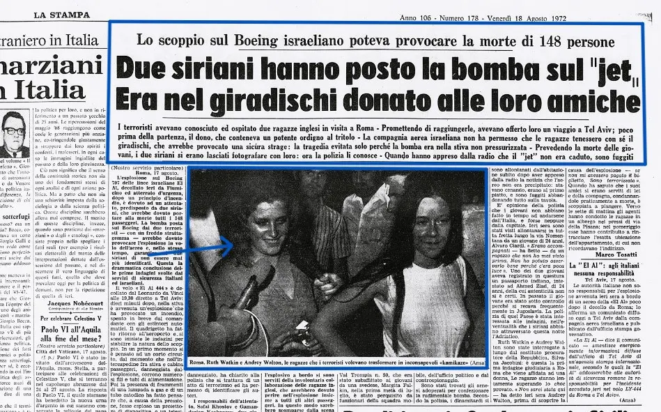 L’attentato (nella foto, particolare, la notizia, a firma dell’inviato Marco Tosatti, riportata sul quotidiano torinese “La Stampa” nell’edizione del 18 agosto di quel 1972), depotenziato dalla catasta delle valigie per la collocazione dell’ordigno nella stiva non pressurizzata - per singolare regola interna del gestore del servizio di linea che non consentiva ai clienti di tenere il bagaglio a mano - avrebbe potuto causare molti altri danni e verosimilmente sarebbe stato in grado di uccidere alcuni tra i presenti a bordo: che erano 140 passeggeri più 8 componenti l’equipaggio.