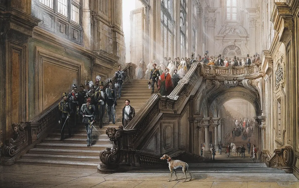 Oggi, ma nel 1860, a Torino, con regio decreto numero 4504 del 17 dicembre 1860 veniva dichiarata chiusa la VII legislatura, iniziata il 2 aprile precedente, e la Camera dei deputati del regno di Sardegna, presieduta da Giovanni Lanza e composta da 387 onorevoli convocati per 73 sedute, veniva sciolta per consentire l’indizione delle elezioni dei primi rappresentanti del regno d’Italia. Era la fine di un’epoca (nella foto, particolare, il dipinto, a tempera su carta montata su tela, di 56,5 x 71 centimetri, di Carlo Bossoli da Lugano, intitolato “Re Vittorio Emanuele II, il conte di Cavour, i ministri e la corte discendono lo scalone imperiale di Palazzo Madama dopo l’inaugurazione della V legislatura subalpina, 1853”, conservato nel Museo nazionale del Risorgimento del capoluogo piemontese) per il Belpaese.