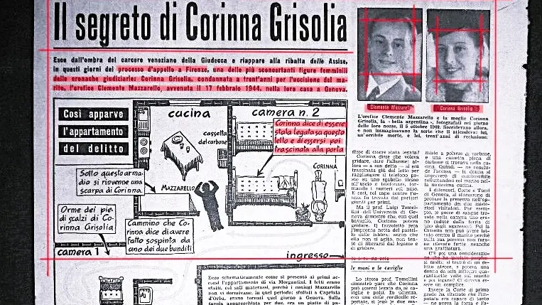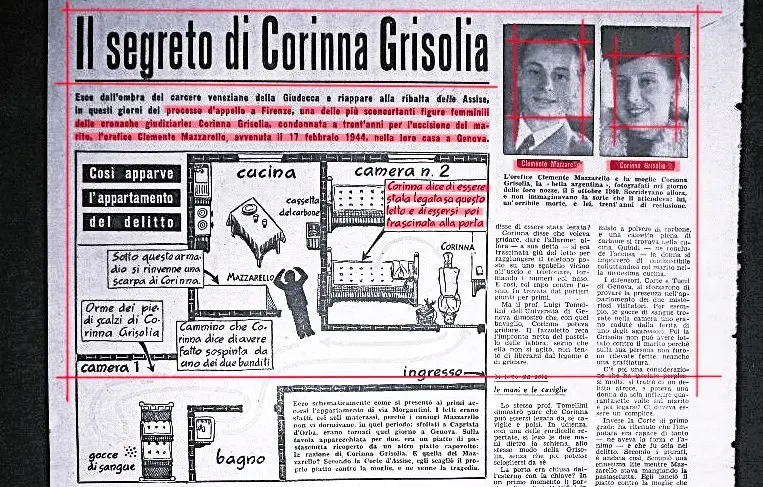 Oggi, ma nel 1944, a Genova, al civico 20 di via Luigi Mercantini, alle 13.30, Cora “Corinna” Grisolia, di 30 anni, argentina di Buenos Aires, ex entraineuse in una casa di appuntamenti di Torino, uccideva, con 47 coltellate, il marito Clemente Mazzarello, di 36, orefice, sposato quattro anni addietro, per derubarlo simulando una rapina. Il caso, anche per la notorietà della vittima, destava enorme clamore mediatico non solo nella città della lanterna, ma in tutto il Belpaese. L’unione coniugale (nella foto, particolare, i due evidenziati in rosso in un riepilogo giornalistico risalente al tempo del processo fiorentino d'appello) era stata un vero e proprio inferno per il facoltoso gioielliere perché la consorte aveva continuato a frequentare altri uomini, ad avere abitudini socialmente discutibili, ad essere violenta e ad essere spesso in preda a scatti d’ira.
