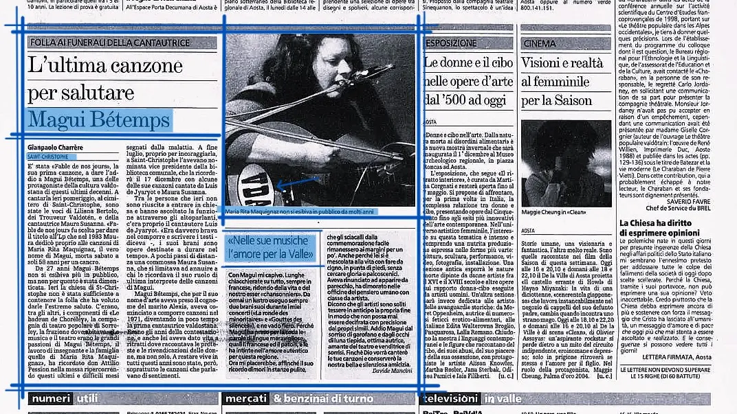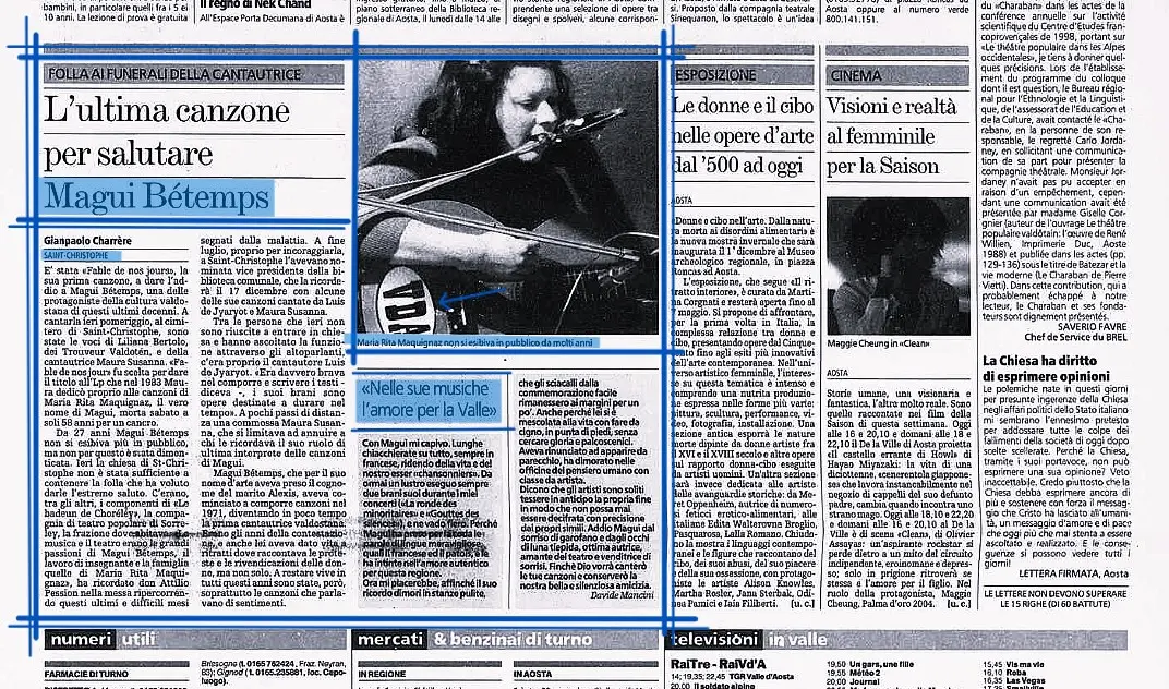 Oggi, ma nel 2005, ad Aosta, si spegneva anzitempo, a 58 anni, per cancro, la voce di protesta della cantautrice valdostana Marie Rita Maquignaz, in arte “Magui Bétemps”, che negli anni Settanta aveva denunciato, in parole - che erano state soprattutto in francese e in patois valligiano - e musica - l’accompagnamento usciva soprattutto dalla sua chitarra - l’eccessiva apertura, a partire dal secondo dopoguerra, dei vertici della Regione autonoma agli stranieri: al Piemonte e più in generale alla civiltà contraria ai veri interessi e alle priorità della gente delle “sue” montagne. Aveva esordito nel 1971, era stata la prima cantautrice della Vallée, ma non si esibiva più in pubblico da 27 anni, ma era comunque altamente considerata per il suo repertorio tradizionale.