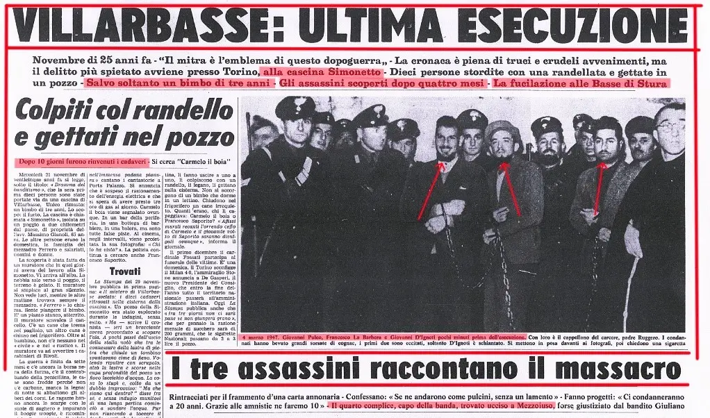 Oggi, ma nel 1945, a Villarbasse, in provincia di Torino, nella Cascina Simonetto, residenza dell’avvocato Massimo Gianoli, già dirigente dell’Agip Piemonte, la banda siciliana originaria di Mezzojuso, composta da Francesco La Barbera, Giovanni Puleo, Giovanni D’Ignoti e Pietro Lala alias “Francesco Saporito”, per rapinare 200mila lire, uccideva dieci persone della famiglia, lasciando in vita solo il piccolo Pierino di 2 anni. Tre dei responsabili verranno catturati e condannati a morte (nella foto, particolare, la notizia rievocata sul quotidiano torinese “La Stampa” del 5 novembre 1970, da sinistra a destra, indicati dalle frecce, Giovanni Puleo, Francesco La Barbera, Giovanni D’Ignoti, prima di essere passati per le armi dei 36 poliziotti del reparto “Celere”).