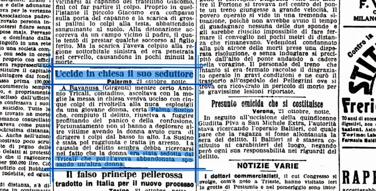 Oggi, ma nel 1925, a Ravanusa, in provincia di Agrigento, nella chiesa madre, ovvero il duomo di San Giacomo, edificata nel 1632, durante la funzione serale del martedì, Palma Susino uccideva con cinque colpi di rivoltella l’ex amante Antonio Tricali, agricoltore, intento a seguire la messa insieme alla moglie, reo di averla amata e poi averla lasciata preferendo impalmare l’altra donna. L’assassina sparava puntando l’arma dal basso verso l’alto – come riporterà il quotidiano meneghino “Corriere della Sera” nel pezzo intitolato “Uccide in chiesa il suo seduttore” del giorno dopo, 21 ottobre 1925 – e tale accorgimento evitava di far fuori o comunque ferire anche altri fedeli raccolti in preghiera.