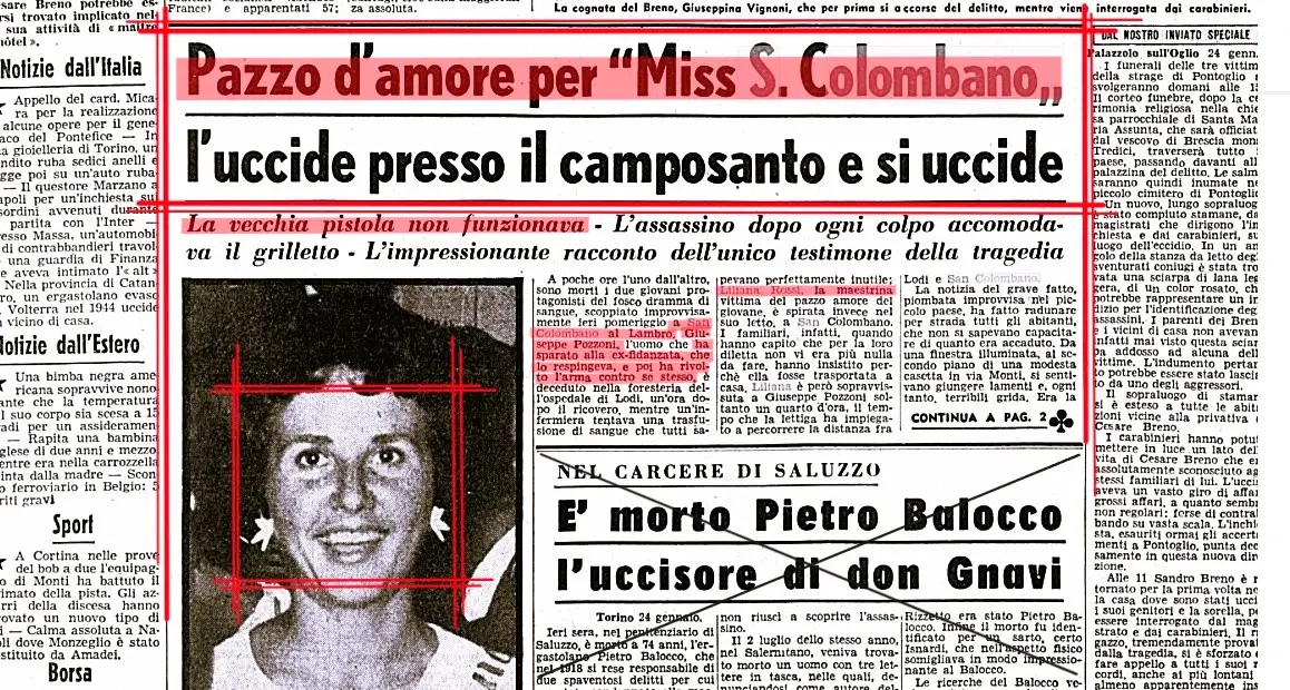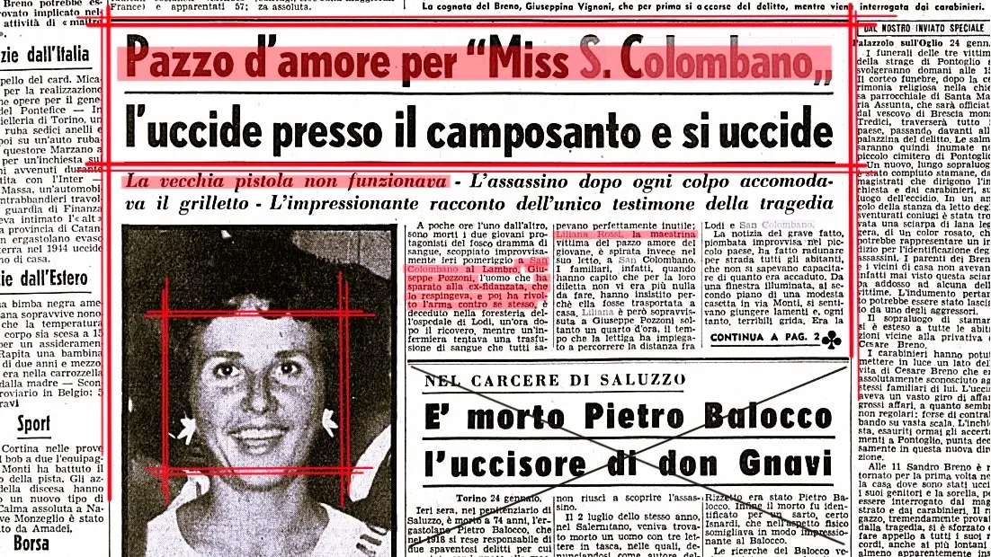 Oggi, ma nel 1956, a San Colombano al Lambro, in provincia di Milano, lungo la strada tra Lodi e Pavia, nella frazione Campagna, a ridosso del cimitero, alle 17.30, Carlo Pozzoni, operaio meccanico in un calzificio del capoluogo lombardo, di 28 anni, della frazione Alberone di Chignolo Po, nel pavese, assassinava l’ex fidanzata Liliana Rossi, maestra elementare, di 25, per motivi passionali, con due colpi di rivoltella calibro 6.35 al volto, e poi si suicidava puntando l’arma, che s'inceppava due volte, contro la propria tempia destra. Il tutto avveniva sotto gli occhi della madre di lei, Bianca Bassi e del contadino Ignazio Coldani. Sarà proprio Coldani, più che la Bassi, lacerata dal dolore, a testimoniare le modalità del duplice fatto di sangue. Per lei era inutile la corsa verso l’ospedale lodigiano come l'intervento chirurgico tentato dai medici. Tuttavia riusciva a spirare nella propria abitazione di famiglia, in via Giuseppe Monti. I due giovani s’erano lasciati da sei mesi e non si erano rivisti durante quel lasso di tempo. Nonostante le pressioni di lui, che voleva sposarla, lei non voleva assolutamente saperne di tornare insieme. Anche perché lui aveva iniziato ad avere comportamenti ritenuti “strani” dai conoscenti. La Rossi (nella foto, particolare, pubblicata sul quotidiano milanese “Corriere d’Informazione”, del 24 gennaio di quel 1956), che tornava in bicicletta e s’era fermata a chiacchierare con una collega di lavoro, nel novembre 1955 era stata eletta “Miss” proprio della cittadina natale del futuro beato Carlo Gnocchi. Quest’ultimo, già cappellano militare degli alpini durante il secondo conflitto mondiale, nel 1948, a belligeranza ultimata, aveva dato vita alla Fondazione pro infanzia mutilata. La Rossi e Pozzoni s’erano conosciuti proprio in occasione del concorso di bellezza e, ovviamente, lui era geloso di lei e della sua avvenenza, tenuta in grande considerazione nel circondario. Pozzoni aveva lasciato una lettera indirizzata al padre nella quale chiedeva perdono per il suo gesto e sottolineava che preferiva farla finita perché amava troppo la "sua" Liliana.