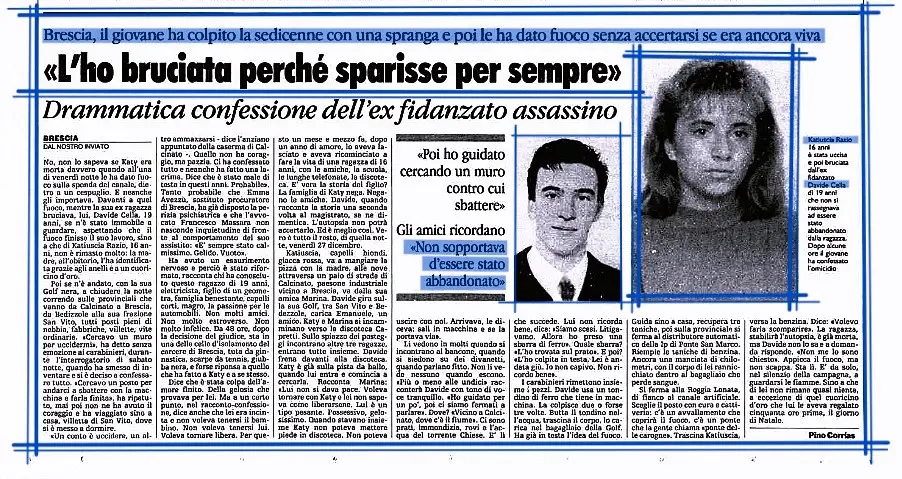 Oggi, ma nel 1991, a Bedizzole, in provincia di Brescia, al Parco degli alpini, Davide Cella, elettricista di 19 anni originario della frazione San Vito, uccideva sfondandole il cranio a colpi di spranga di ferro la ex fidanzata Katiuscia Razio, studentessa di 16 della frazione Calcinatello di Calcinato, e la bruciava nella discarica di Garletti, al “Ponte delle carogne”, vicino al fiume Chiese, mentre era ancora agonizzante. Il ragazzo era stato lasciato dalla vittima un mese e mezzo addietro, dopo 18 mesi trascorsi insieme, e lei non voleva più saperne di tornare uniti. La madre Agnese identificherà “Katy” grazie agli anelli e al cuoricino d’oro regalatole dal carnefice per Natale: perché il cadavere carbonizzato, ritrovato la mattina del 28 dicembre dai carabinieri della compagnia di Desenzano del Garda, sarà irriconoscibile. Lui, dopo il primo tentativo di sviare la responsabilità, messo alle strette confesserà. Sosterrà di aver pure tentato il suicidio dopo il rogo appiccato versando sul corpo di lei tre tanichette di benzina riempite al distributore Ip di Ponte San Marco, ma di non esserci riuscito. Dirà anche che lei fosse incinta e che non volesse tenere il bambino. Ma l’autopsia non potrà accertarlo. Prima di farla fuori lui era andata a prenderla alla discoteca “El Kubra” di Calcinato e nel dancing avevano anche avuto un furioso litigio. Stando al racconto di Gianlorenzo Zaniboni, amico di lei, sulle pagine della cronaca bresciana del giornale milanese “Corriere della Sera”, del 24 dicembre 2021, in occasione dei 30 anni dal femminicidio, lui era molto geloso e non voleva che lei andasse a ballare con le amiche. Lei non sopportava più la possessività e la mancanza di libertà. E non sapeva come togliersi Davide di torno. L’assassino (nella foto, particolare, accanto alla malcapitata, nel pezzo sul quotidiano torinese “La Stampa”, del 30 dicembre successivo, a firma di Pino Corrias), dopo essere stato sottoposto a perizia psichiatrica, verrà condannato, in appello, a 11 anni e 6 mesi di carcere, con sentenza che poi diverrà definitiva, rispetto ai 12 anni di reclusione avuti nel giudizio di primo grado.