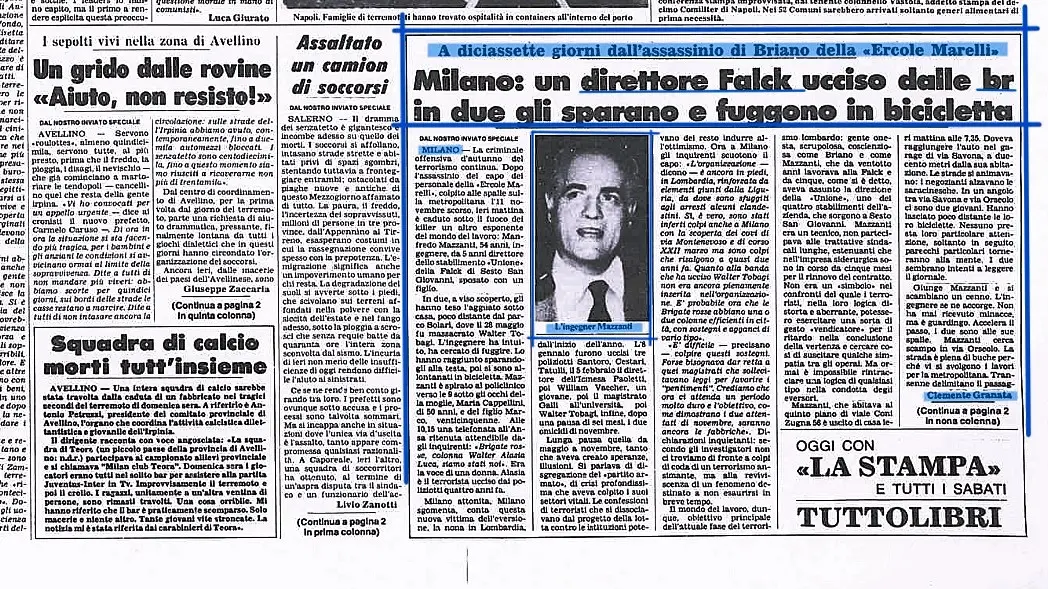Oggi, ma nel 1980, a Milano, all’altezza del civico 12 di via Pietro Orseolo, dove abitava, il gruppo di fuoco brigatista della colonna milanese “Walter Alasia”, capeggiato da Pasqua Aurora Betti, in disaccordo con il coordinamento nazionale, assassinava con quattro colpi di pistola l’ingegnere Manfredo Mazzanti, di 54 anni, dal ’76 direttore tecnico dello stabilimento di Sesto San Giovanni delle acciaierie Falck Unione, che il 13 luglio 1978 era stato insignito del titolo di commendatore al merito della Repubblica italiana. Il commando delle Br meneghine (nella foto, particolare, la notizia del raid contro Mazzanti, nel pezzo a firma dell’inviato Clemente Granata riportato sulla prima pagina del quotidiano torinese “La Stampa” del 29 novembre 1980) si isolerà sempre più dal vertice centrale e verrà guidato da Pasqua Aurora Betti, che prenderà il posto di Mario Moretti, che sarà arrestato il 4 aprile 1981.