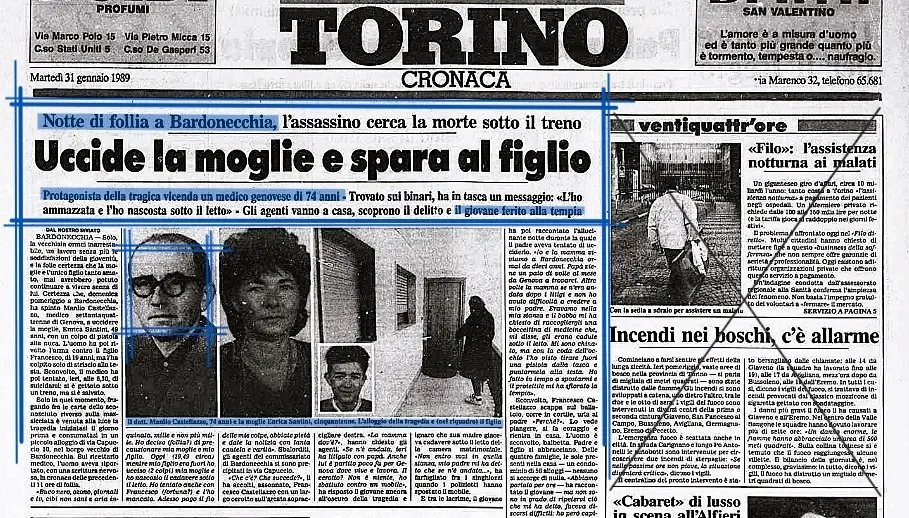 Oggi, ma nel 1989, a Bardonecchia, in provincia di Torino, al civico 10 di viale Mario Capuccio, nel borgo vecchio, alle 19,49, Manlio Castellazzo, medico genovese in pensione, di 74 anni, per raptus uccideva, con un colpo di pistola Beretta calibro 6,35 ereditata dal padre indirizzato alla nuca, la moglie Enrica Santini, di 50, e feriva il figlio Francesco, di 19, prendendolo di striscio alla fronte, nel tentativo di eliminarlo. Poi, nel locale scalo ferroviario, tentava il suicidio lanciandosi sotto il treno delle 6.30 del giorno dopo, 30 gennaio, proveniente da Modane, ma di fatto quasi fermo, riuscendo a rimediare solo il trauma cranico giudicato dai sanitari dell’ospedale torinese delle Molinette guaribile in un mese (nella foto, particolare, la notizia riportata sul quotidiano torinese “La Stampa”, del 31 gennaio di quel 1989, a firma di Beppe Minello).