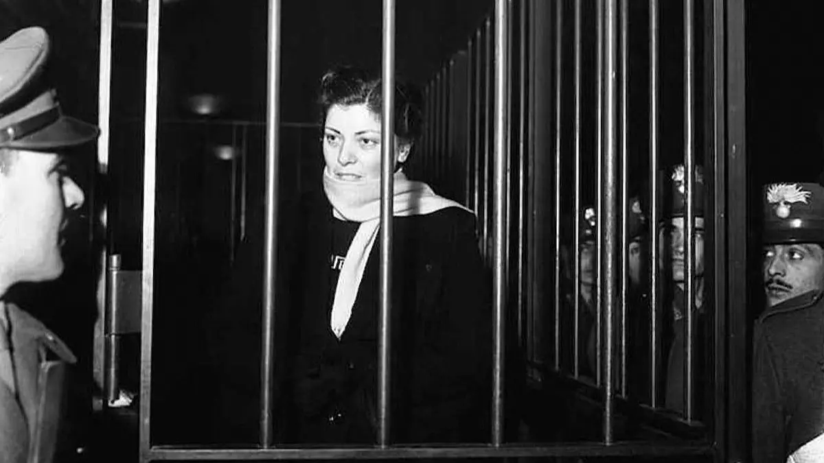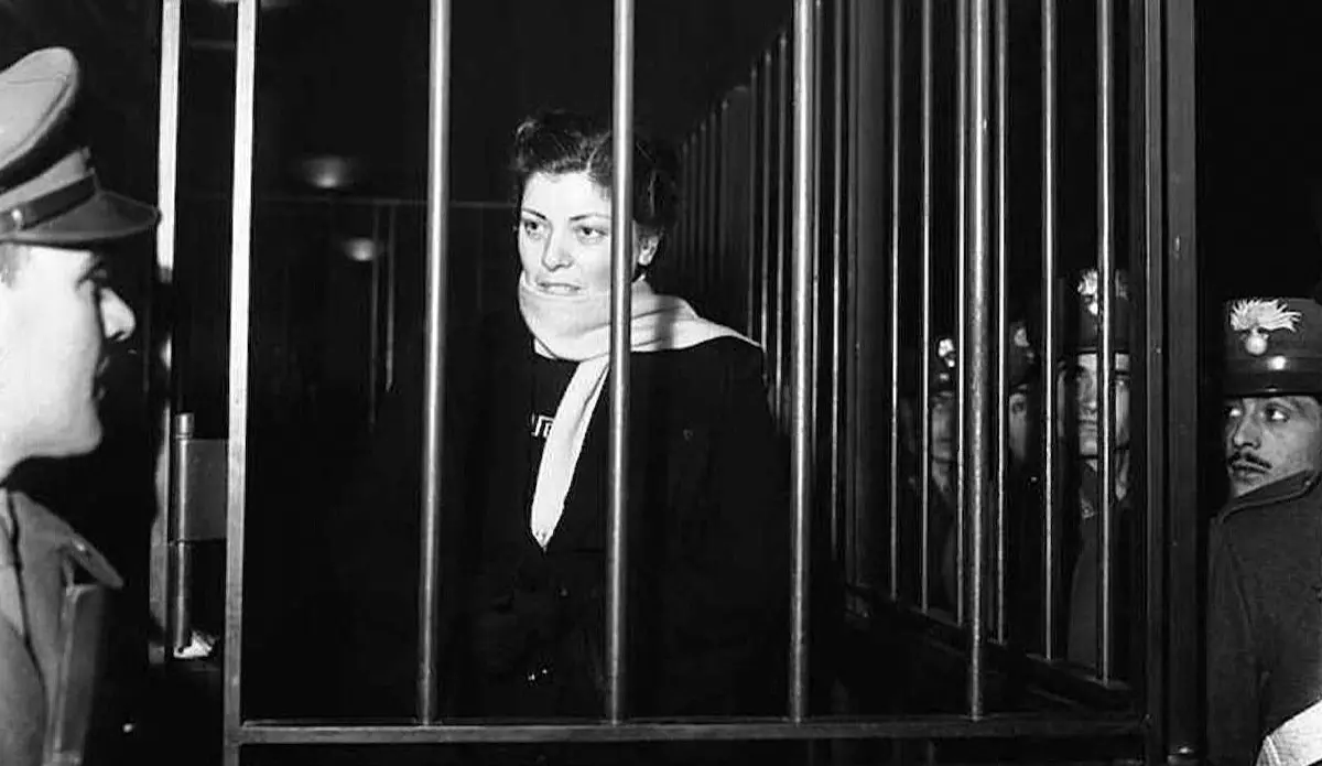 Il quadruplice omicidio commesso dalla Fort destava enorme clamore mediatico e l’iter giudiziario verrà seguito con grande attenzione nel Belpaese. Anche grazie ai pezzi del nerista di razza Dino Buzzati per il “Nuovo Corriere della Sera” che poi verranno riuniti nel volume I de “La nera di Buzzati”, raccolta dal 1926 al 1971, che sarà curata da Lorenzo Viganò, altra firma del “Corsera” e gran studioso del romanziere del “Deserto dei Tartari”, e uscirà nel 2002 per l’editore milanese Mondadori. Al processo (nella foto, particolare, la Fort nel gabbione degli imputati, nell’udienza d’apertura del processo di primo grado, nella corte d’assise milanese, il 10 gennaio 1950, col viso parzialmente celato dalla sciapa gialla che le farà conquistare il soprannome di “Belva con la sciarpa color canarino”). Il 9 aprile 1952 verrà condannata all’ergastolo, e la sentenza diverrà definitiva, il 25 novembre 1953, dopo il passaggio in Corte di cassazione.