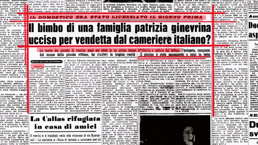 Oggi, ma nel 1959, a Ginevra, in Svizzera, nella villa Grand-Sacconex, un sicario, destinato a rimanere ignoto, uccideva a colpi di oggetto contundente, che non sarà mai ritrovato, Nicolas d’Espine-Sarasin, di 21 mesi, figlio di Pierre d’Espine e Catherine Sarasin il delitto rimarrà senza un colpevole assicurato alla giustizia. Il bambino veniva rinvenuto in una pozza di sangue, sul pavimento della sua stanza al primo piano, non distante dal lettino con tanto di sbarre nel quale dormiva. L’omicidio destava enorme scalpore a livello internazionale. Anche perché Pierre d’Espine, impiegato in banca, era il figlio del presidente della Lega delle chiese protestanti. E soprattutto nel Belpaese per via della presenza del cameriere italiano, Mario Breno, di 35 anni, originale di Mornico al Serio, in provincia di Bergamo, tra i sospettati. Quest’ultimo veniva inizialmente portato in carcere e tenuto in cella d’isolamento per otto giorni in quanto ritenuto il potenziale killer (nella foto, particolare, la notizia riportata sul quotidiano torinese “La Stampa”, nel pezzo di Elena Fisher del 7 ottobre 1959), anche perché era stato licenziato, per comportamenti poco rispettosi nei confronti dei proprietari di casa nonché datori di lavoro, ma poi già il 12 ottobre successivo verrà chiarito il suo essere estraneo al delitto anche se per avere il proscioglimento bisognerà attendere il 1961. Anzi, nonostante il carattere burbero s’era affezionato al piccolo. Quindi, il 15 marzo 1961, l’attenzione della magistratura e de si accenderanno sulla transalpina Simone Gorceix, già amante di Pierre d’Espine ed ex socia d’affari del rampollo elvetico. Ma anche tale pista si rivelerà essere una bolla di sapone