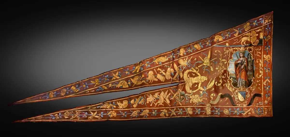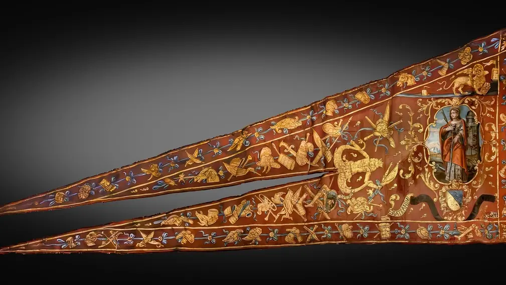 Oggi, ma nel 1861, a Torino, il generale Luigi Federico, conte Menabrea, ministro della Marina dell’Italia unita nel primo governo guidato dal “barone di ferro” Bettino Ricasoli, esponente della Destra storica, confermava la tradizione delle armate di mare preunitarie di tributare onori a Santa Barbara di Nicomedia, martire cristiana dell’Anatolia verosimilmente sottoposta al supplizio del fuoco, ma anche all’asportazione del seno e alla decapitazione, il 4 dicembre 306 dopo Cristo, ad Euchaita nel Ponto bizantino, sotto l’imperatore Massimiano, quale protettrice della forza militare navale. Con la previsione, proprio in tale giorno, di celebrazioni sia per il personale di terra che per quello imbarcato. Nel tempo Santa Barbara diverrà ancor più che nel passato (nella foto, particolare, stendardo navale veneziano del 1659, con l’effige di Santa Barbara, munita di spada che però non è arma difensiva bensì il vero strumento con la quale sia stata uccisa, accompagnata dalla miniatura della caratteristica torre a tre finestre emblema del luogo di reclusione nel quale abbia studiato per giungere alla conclusione di rinnegare il politeismo e optare per la conversione al cristianesimo suscitando la vendetta del padre Dioscoro che l’avrebbe denunciata alle autorità romane, con la palma in mano, la corona in testa, vestita di sontuosi abiti sgargianti invece che denudata come da iconografia successiva al Concilio tridentino conclusosi nel 1563, conservato nel museo Correr, di piazza San Marco, nella città lagunare) emblema della capacità di fronteggiare il pericolo letale, soprattutto quello legato ad esplosioni, allo scoppio di polvere da sparo -per questo i depositi di munizioni, soprattutto delle navi, erano e saranno chiamati Santabarbara- e fiamme, con fede, coraggio, serenità anche andando incontro alla morte. Legata alla parabola di Santa Barbara vi sarebbe anche la vicenda dell’origine della fiaba europea di Rapunzel/Raperonzolo pubblicata dai fratelli tedeschi Jacob e Wilhelm Grimm nella raccolta del 1815. Secondo l’antica narrazione il corpo di Barbara di Nicomedia, nata nel 273 dopo Cristo, aveva respinto spontaneamente il fuoco. Diverrà santa di riferimento anche dei Vigili del fuoco. Ma, per estensione, sarà tutrice pure degli artiglieri, degli armaioli, dei cannonieri, dei campanari, dei carpentieri, dei minatori, dei pirotecnici, degli ombrellai, dei tessitori, dei metallurgici e degli architetti. Stando alla ricostruzione di Flaminio Corner, i resti di Santa Barbara erano stati traslati nella città marciana nel 1003, sotto l’amministrazione del doge Pietro Orseolo II.