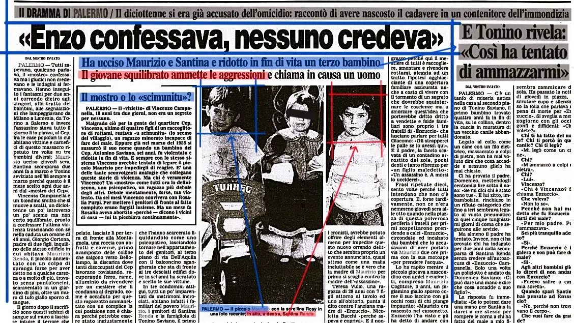 Oggi, ma nel 1992, a Palermo, nel quartiere popolare “Cep”, ovvero Centro espansione periferica, Vincenzo “Enzuccio” Campanella, prossimo ai 18 anni, raccoglitore di rottami, detto ferocemente “U scimunitu” per le sue palesi problematiche psichiche, assassinava Maurizio Renda, di 5, strangolandolo con il filo di ferro, dopo averlo tramortito con una spranga di metallo, e lo gettava nel un pozzo al confine con Borgonuovo, verosimilmente perché il piccolo aveva reagito al tentativo di violenza sessuale. La vittima era il cugino di Santina Renda, di 6 anni, scomparsa sempre dal già menzionato “Cep” del capoluogo siciliano, in via Pietro dell’Aquila, il 23 marzo 1990, e mai ritrovata. Campanella, che stando alle cronache del tempo non risultava squilibrato, ma solo "un po’ inebetito", s’era già autoaccusato del delitto di Santina.