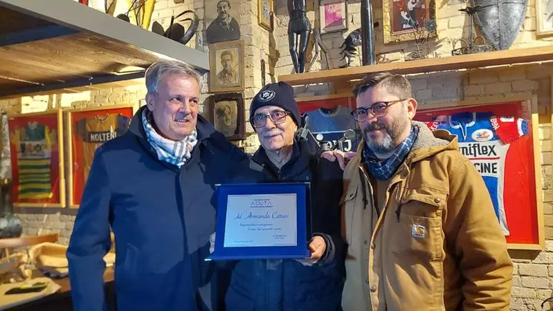 ORTONA. «Imprenditore artigiano. Uomo dal grande cuore». Così è scritto sulla targa con cui l’associazione ortonese di cultura, turismo e artigianato (Acuta) ha voluto premiare Armando Carusi, il ristoratore che ha offerto gratuitamente la sua casa a Palmoli alla “famiglia nel bosco” per permettere i lavori di ristrutturazione del proprio casolare, ormai diventato un simbolo di uno stile di vita alternativo. Il premio, consegnato da Ettore Bucci e Marco Trivilino, è arrivato al termine della due giorni “Omaggio al Maestro”, iniziata ieri e dedicata al compianto scultore del ferro Pietro Trivilino, nella sua storica bottega di via Cavour, a Ortona.