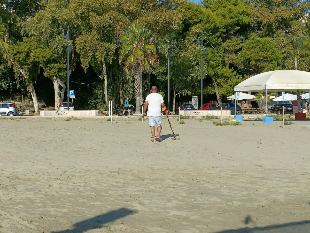 «Sono di Foggia, ma abito a Montenero di Bisaccia. Di mestiere faccio il muratore e nel tempo libero vado a caccia di monete che vengono perse in spiaggia», racconta il ricercatore, tirando fuori dalla tasca una manciata di spiccioli. «L’altro giorno a Termoli è andata molto bene: ho raccolto monete pari alla somma di 120 euro. Il bottino, a volte, è veramente notevole. Mi sposto di continuo, non mi limito solo alle spiagge». E poi ha continuato la sua ricerca, concentrandosi sul suono del suo metal detector e sotto lo sguardo dei bagnanti presenti in spiaggia per godersi la bella giornata di sole settembrino. L’uomo si è poi allontanato per continuare la sua ricerca altrove.