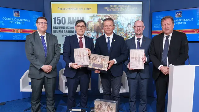 (Arv) Venezia 7 ott. 2025 - Oggi, a palazzo Ferro Fini, è stata presentata l’opera ‘150 anni dell'immigrazione italiana nel Rio Grande do Sul’, curata dall’Università brasiliana di Caxias do Sul. Si tratta di un’opera straordinaria, frutto del lavoro, durato due anni, di decine di studiosi e del coinvolgimento di molte università italiane e brasiliane, che presenta una ricca iconografia, offrendo così una visione ampia e documentata del fenomeno migratorio. Ricordiamo che sono circa 4 milioni i discendenti dei pionieri che, a partire dal 1875, colonizzarono il Rio Grande do Sul, lo Stato più a Sud del Brasile. Mentre sono 150 mila i cittadini italiani ivi residenti.