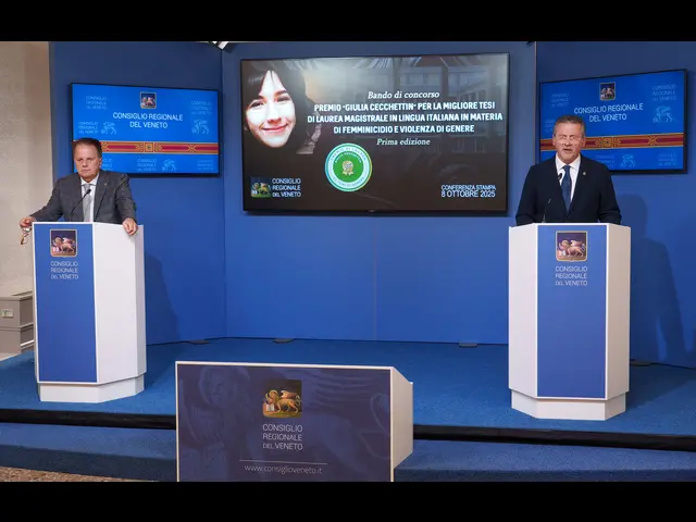(Arv) Venezia 8 ott. 2025 - Il Presidente del Consiglio regionale del Veneto, Roberto Ciambetti, e il Segretario Generale, Roberto Valente, hanno presentato oggi, a palazzo Ferro Fini, la prima edizione del Premio ‘Giulia Cecchettin’ per la migliore tesi di laurea magistrale in lingua italiana in materia di femminicidio e di violenza di genere.