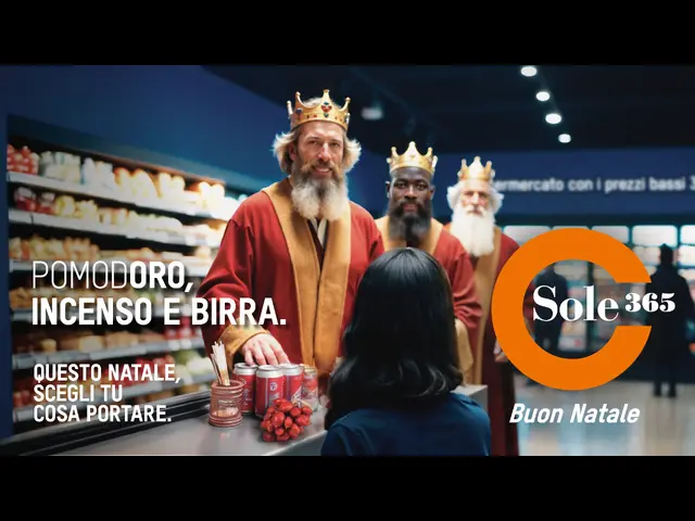 È quel momento dell'anno in cui i clienti Sole365 passeggiano fra i reparti, come dei moderni Re Magi, alla ricerca delle chicche più preziose da portare in tavola. Che tu sia un fedele seguace delle specialità della tradizione o un amante delle rivisitazioni gourmet, da Sole365 troverai tutto ciò che cerchi. L'offerta di Sole365 va ben oltre i classici "Oro, incenso e mirra”:ogni reparto è una festa di sapori, un trionfo di eccellenze gastronomiche da acquistare nei punti vendita e online, su CosìComodo o tramite l’APP Sole365. Così, Sole365, all'interno della sua nuova campagna di Natale, gioca con una creatività dal piglio ironico e simpatico che trasforma l’antica offerta in “Pomodoro, incenso e birra”, invitando i suoi clienti a scegliere con leggerezza cosa portare in tavola a Natale.