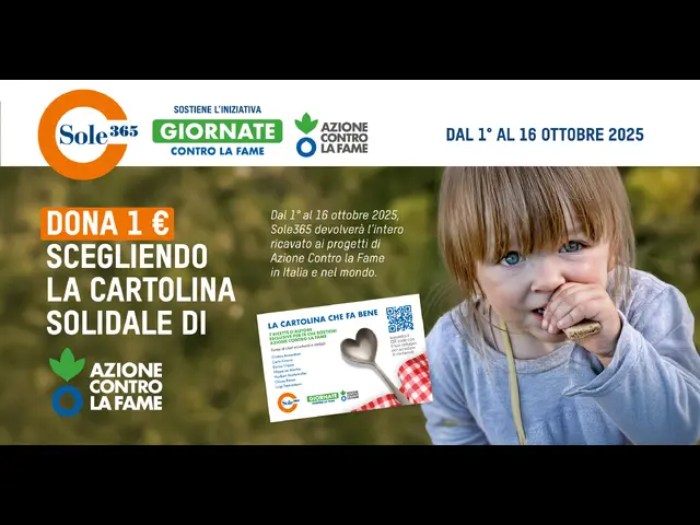 L'iniziativa che Sole365 sostiene con grande entusiasmo è "Giornate Contro la Fame", una campagna nazionale promossa da Azione Contro la Fame che mira a sensibilizzare e mobilitare l'opinione pubblica sul diritto fondamentale al cibo e a una sana alimentazione, in Italia e nel mondo. L’iniziativa partirà il 1° ottobre, in tutti i punti vendita Sole365 e anche online, terminerà il 16 ottobre in occasione della Giornata Mondiale dell’Alimentazione.