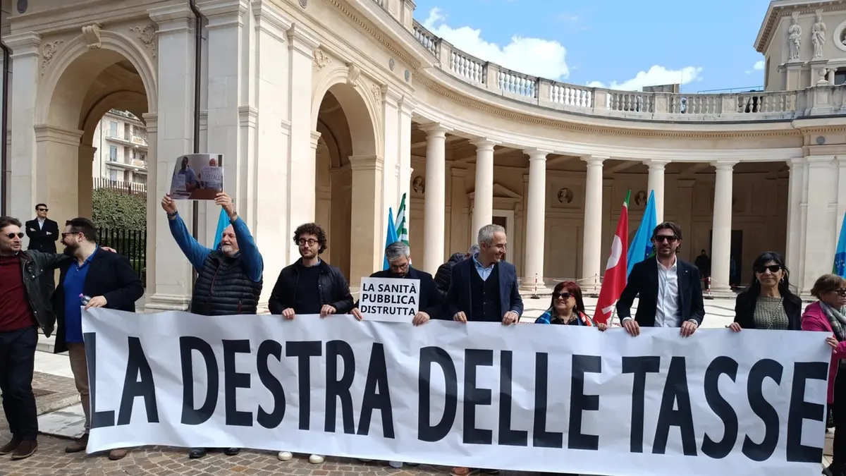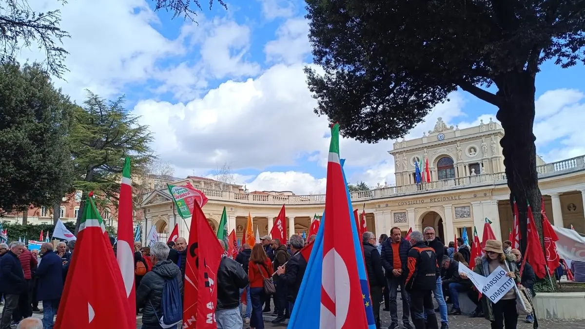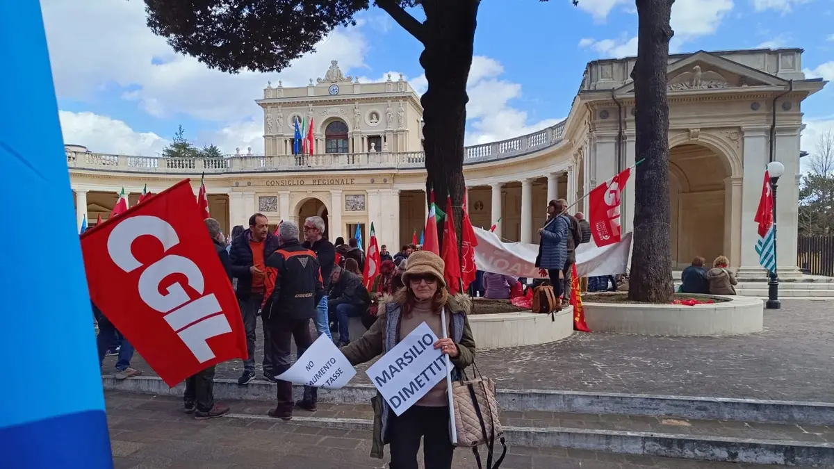 Dopo l'occupazione di questa mattina, è iniziato poco fa il sit in con i sindacati fuori dal Consiglio regionale dell'Aquila. Tanti i partecipanti con slogan e striscioni contro l'aumento delle tasse e il debito della sanità