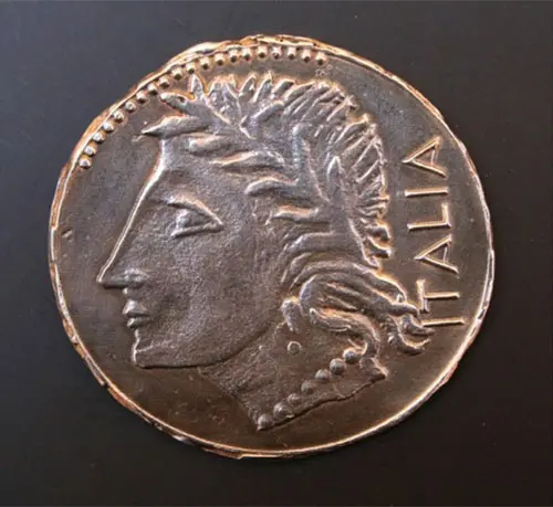 Realizzata dai maestri d'arte orafa Eugenio di Rienzo di Scanno e Italo Lupo di Pescara, raffigura da un lato un volto femminile come personificazione dell'Italia, nome inciso esplicitamente, e dall'altro una immagine del giuramento tra i guerrieri italici con le spade protese nell'imminenza del sacrificio animale di un porcellino, come da cerimoniale dell'epoca. La sua storia prende forma nell'inverno dell'anno 90 avanti Cristo quando un gruppo di popolazioni dell'attuale Italia centro-meridionale, che comprendeva Marsi, Peligni, Vestini, Marrucini, Piceni, Frentani, Irpini, Lucani e Sanniti, finì con il diventare un vero e proprio stato antagonista a quello romano. Questo perchè, nonostante l'alleanza di vecchia data con i romani stessi, la lunga militanza nell'esercito e la lealtà dimostrata, questi popoli non riuscivano a conquistare la cittadinanza romana a pieno titolo.