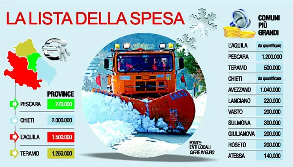 Per ora in testa alla classifica degli enti locali che hanno speso di più nei giorni dell'emergenza c'è la Provincia di Chieti, la più estesa quanto a rete stradale, con 2milioni di euro; al secondo posto, c'è la Provincia dell'Aquila con 1 milione e mezzo di euro. Quasi da record in ribasso invece il conto presentato dalla Provincia di Pescara ("solo" 270mila euro) mentre Teramo ha anticipato un milione e mezzo.