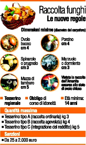 Limiti raccolta. La legge conferma i limiti della raccolta (vedi tabella) ma cancella la possibilità di raccogliere a scopo didattico funghi non inseriti nell’elenco. Per l’autorizzazione alla raccolta occorre il possesso di un tesserino regionale rilasciato dalla provincia competente, valido sull’intero territorio regionale.