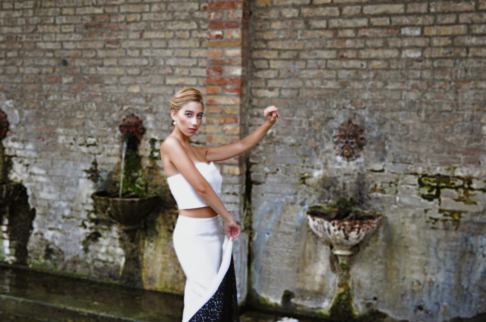 Questo abito è quello che è mi è piaciuto di più , forse perchè è a due pezzi : corpetto con dolce scollo a cuore e gonna con strascico in pizzo parigino sul lato posteriore , o forse per il semplice ma forte contrasto reso dal bianco candido ed il pizzo nero ....non so ma la bianca seta sembra rischiarare le scure e antiche rovine della città come un raggio il primo raggio di sole che squarcia il cielo scuro dopo un temporale .