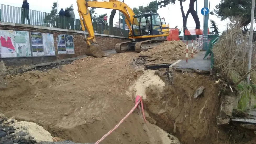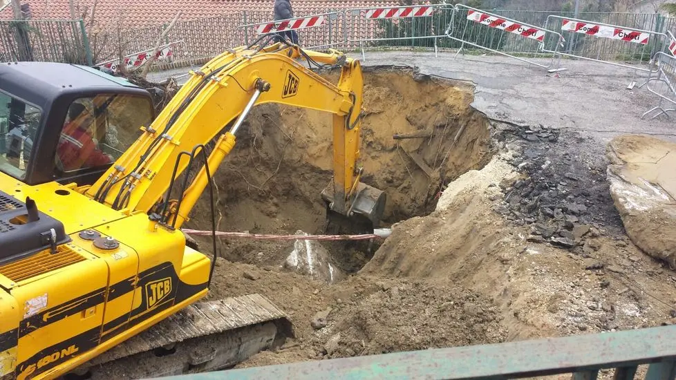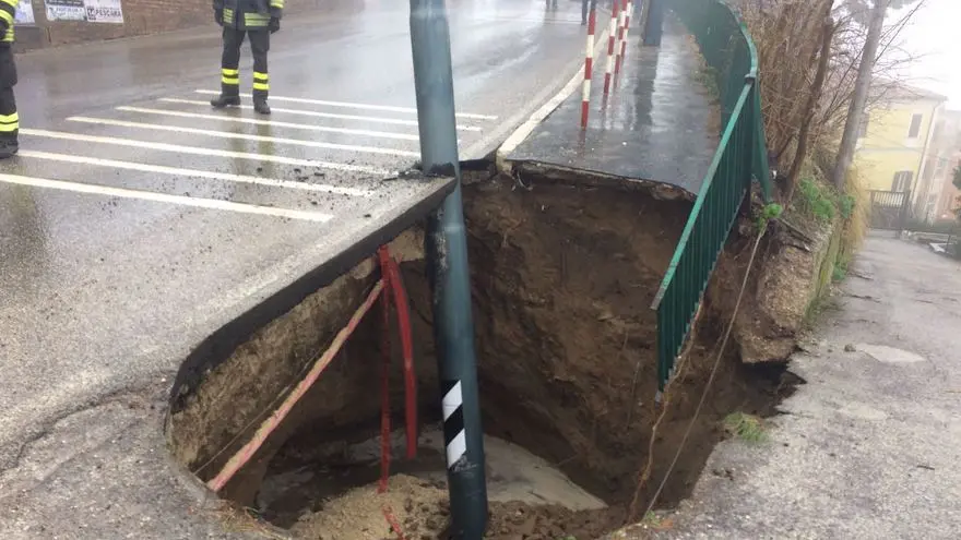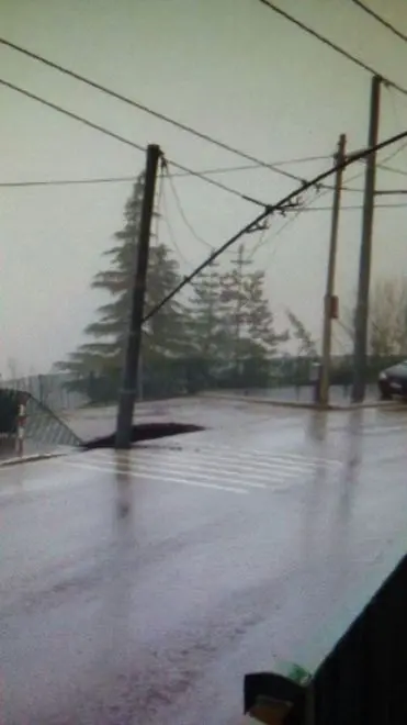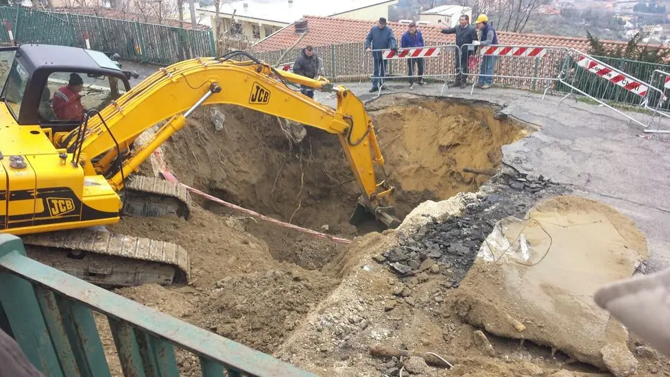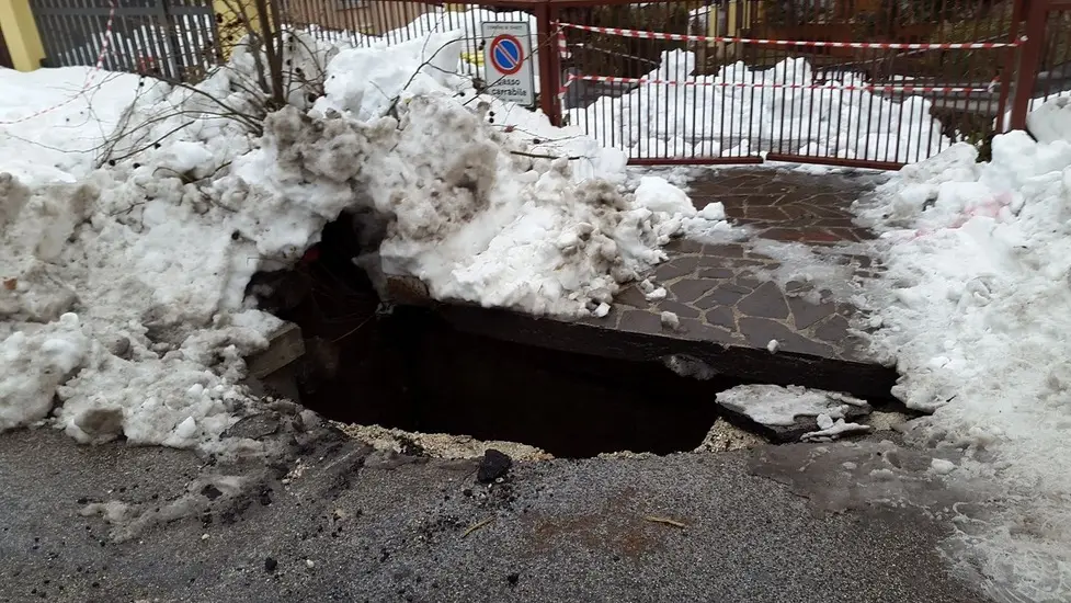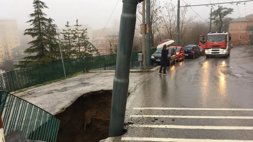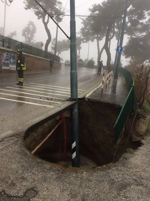 In via Olivieri, poi, la voragine. Lì sotto c’è il vuoto: «A seguito delle verifiche effettuate nell’area, è stata riscontrata la rottura di un tratto di fogna situata a sette metri di profondità rispetto al manto stradale, che ha convogliato terreno e detriti finiti nel tratto fognario, che arriva fino a via Gran Sasso», fa sapere l’assessore ai lavori pubblici Raffaele Di Felice, intervenuto sul posto insieme al sindaco Umberto Di Primio, a tecnici e operai del Comune, a Sandro Chiacchiaretta della Panoramica e ai vigili del fuoco. «Data la complessità dell’intervento su via Olivieri dove il cedimento ha interessato più linee fognarie, una linea della media tensione dell’Enel, una linea dei telefoni di Stato e la linea della Telecom, nonché le sovrastanti linee elettriche della filovia, si è disposta la chiusura al transito veicolare fino a che verranno ripristinate le condizioni di sicurezza», continua l’assessore, «si tratta di una fogna molto vecchia, fatta di mattoni e pietre». Il palo che ha ceduto e si è adagiato sulla filovia, in questi giorni inattiva per lavori di manutenzione, è stato rimosso con una gru dai vigili del fuoco. L’ufficio tecnico comunale, invece, ha già provveduto ad affidare gli interventi di somma urgenza che si protrarranno per almeno una settimana.
