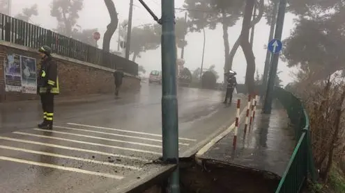 Paura in via Olivieri. Un palo del filobus finisce inghiottito. Disagi anche in altre zone: strade distrutte, crolla un muraglione e il fango invade le case
