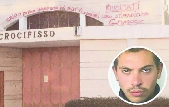 Ci sono anche altri episodi di scritte con la firma Gomez. Quella che ha fatto più parlare attirando l’attenzione dei frequentatori di piazzale Marconi è stata realizzata circa un anno prima, a fine novembre del 2014. Sempre con il favore della notte, il giovane aveva lasciato una “dedica”, questa volta molto più grande e plateale, sulla facciata principale della chiesa del Santissimo Crocifisso. Sfruttando doti da equilibrista, si era arrampicato sopra il portone principale della chiesa e aveva sfruttato l’ampia facciata in tutta la sua larghezza per lasciare i soliti pensieri sulla crisi, “parola inventata dai politici per coprire i loro stipendi”. C’era infine un eplicito suggerimento alla rivolta e la solita firma Gomez.