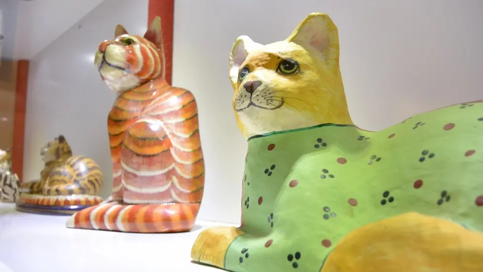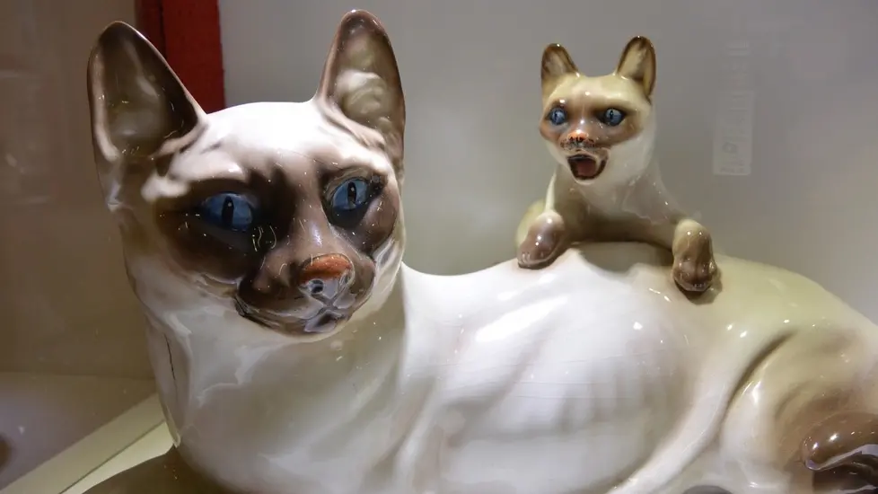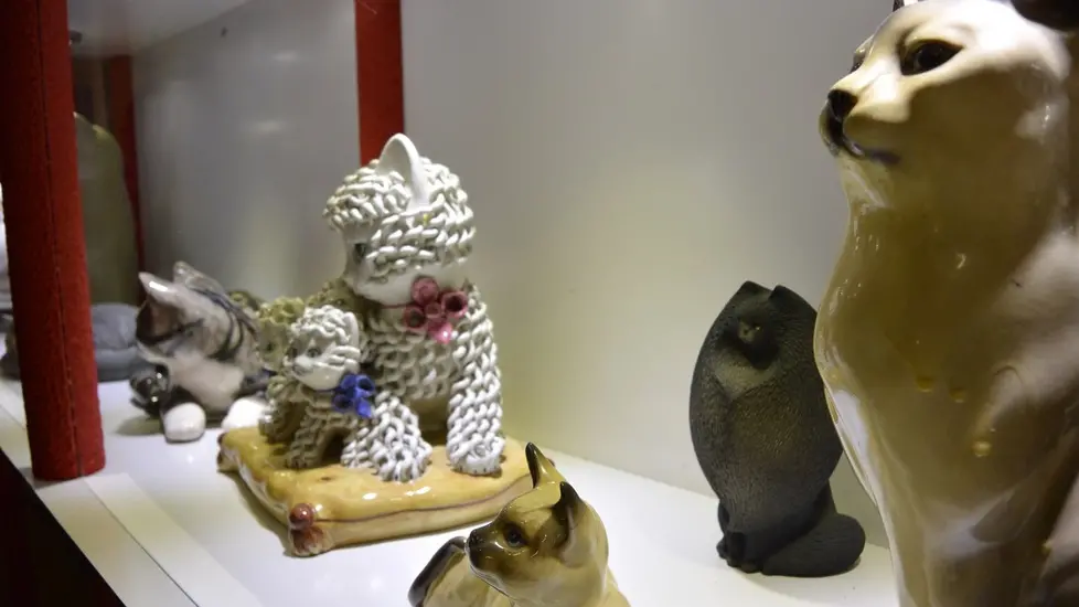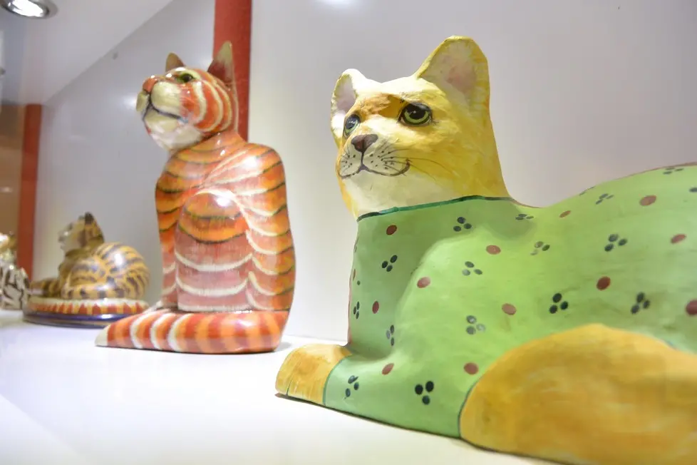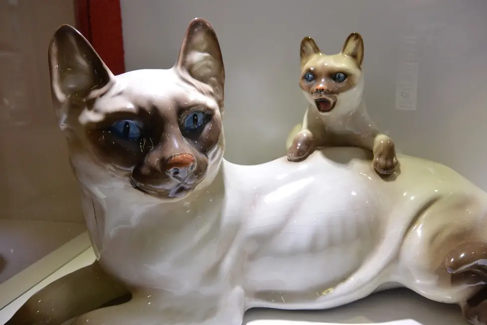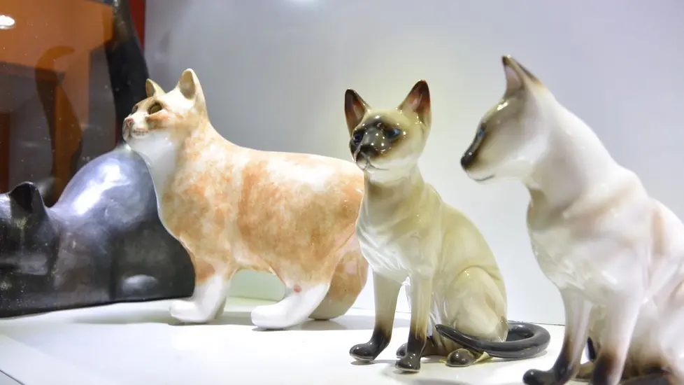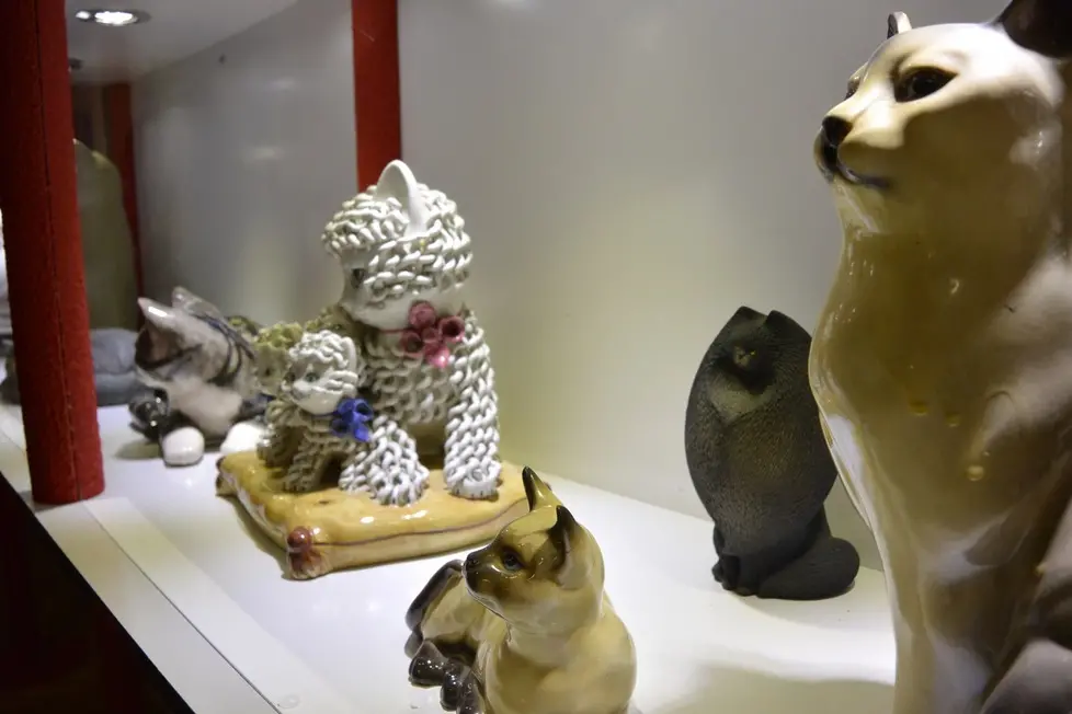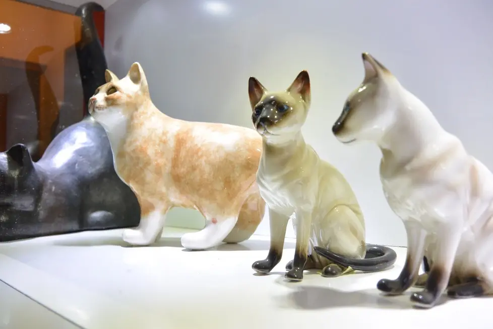 Tra i pezzi più preziosi vi sono olii e acqueforti dell'Ottocento, due dipinti di Novella Parigini, cartoline francesi del primo Novecento, gatti egiziani di lapislazzuli, alabastro, ossidiana, terracotta, dei magnifici pezzi cinesi in porcellana e smalti. Tra gli oggetti più rari un gatto cinese poggiatesta per fumatori d'oppio (primo Novecento) e gatti giapponesi maneki-neko, o "gatto che invita", simbolo di prosperità in affari e di protezione delle case, raffigurati con una zampa alzata e con sacchetti di monete.