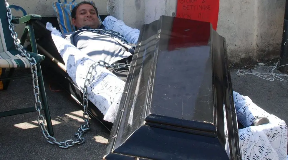 Tutto è iniziato nel 2004 quando, per protestare contro il Comune di Trasacco per il mancato rinnovo del pascolo, si era arrampicato sul campanile della chiesa di San Cesidio. Nel 2009 si era incatenato addirittura dentro una bara davanti alla sede Asl di via Monte Velino, ad Avezzano, accusando l’Ente Parco del mancato risarcimento dei 70 bovini che gli erano stati sbranati dai lupi e dagli orsi. «Visto che così non posso andare avanti», aveva dichiarato all’epoca, «è come se fossi morto, tanto vale che anticipo i tempi al Parco e alla Asl e mi faccio trovare già dentro la bara».