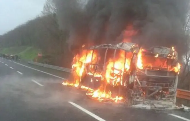 A24 chiusa per un’ora. L’incendio del pullman che viaggiava in direzione Teramo avvenuto nel Lazio