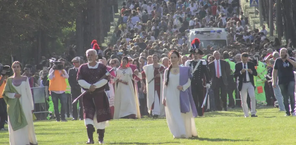 Bella e significativa anche l’iniziativa di far sfilare i gonfaloni listati a lutto e la delegazione dei consiglieri comunali con il lutto al braccio. Ma vediamo nel dettaglio ciò che accadrà domani durante il corteo storico che sarà ridotto all’essenziale. Partirà alle 17 dalla villa comunale e si snoderà fino al piazzale antistante la basilica di Santa Maria di Collemaggio. La parte istituzionale sarà limitata dai gonfaloni, listati a lutto, del Comune dell’Aquila (accompagnato dal presidente del Consiglio comunale Carlo Benedetti e da una delegazione di consiglieri con il lutto al braccio), della Regione Abruzzo, con i presidenti della giunta regionale Luciano D’Alfonso e del Consiglio regionale Giuseppe Di Pangrazio, e della Provincia dell’Aquila, con il presidente Antonio De Crescentiis. Saranno presenti, inoltre, il prefetto Francesco Alecci e il questore Alfonso Terribile. La parte storica, anch’essa molto ridotta nel numero dei partecipanti, sarà composta da una ventina di figuranti, in rappresentanza dei quattro quarti aquilani e della Giostra Cavalleresca di Sulmona, cui si aggiungeranno le tre principali figure del Corteo, vale a dire la Dama della Bolla (Eleonora Ciocca), il Giovin Signore (Ferdinando Carluccio) e la Dama della Croce (Francesca Pancella). Quattro dei figuranti accompagneranno il Gonfalone medievale della città dell’Aquila. A chiudere il Corteo, il sindaco dell’Aquila Massimo Cialente, accompagnato dal comandante del Corpo di Polizia Municipale Ernesto Grippo.
