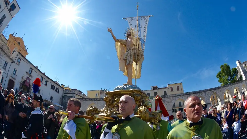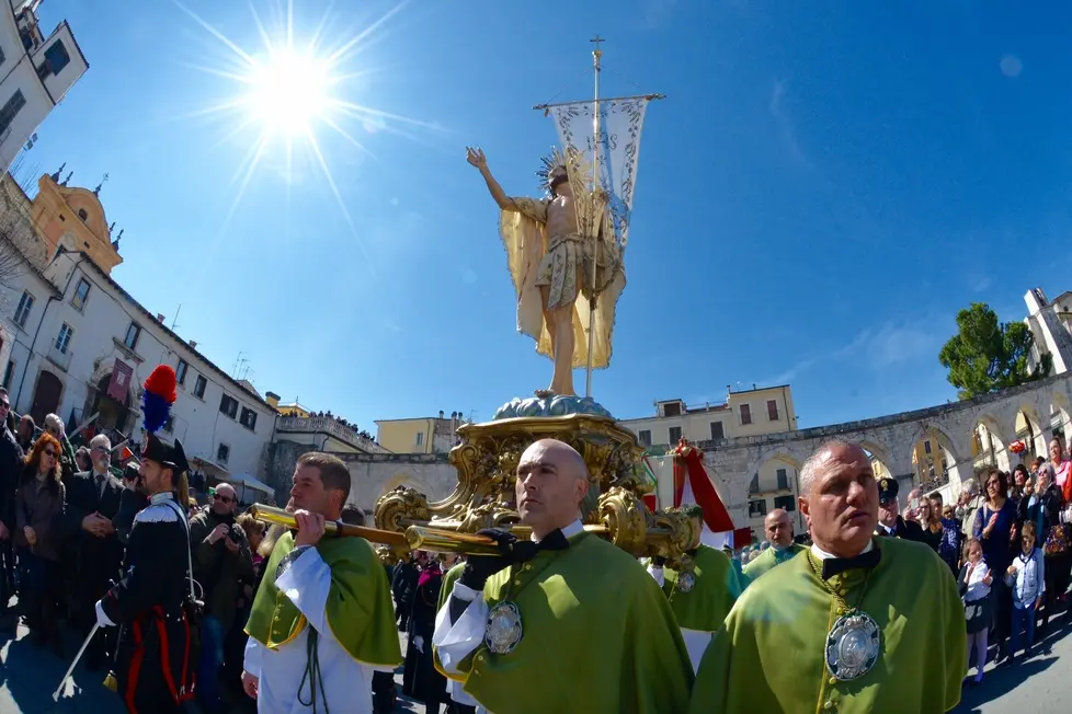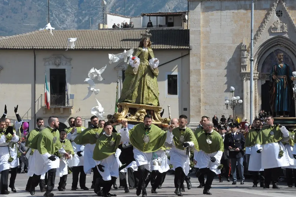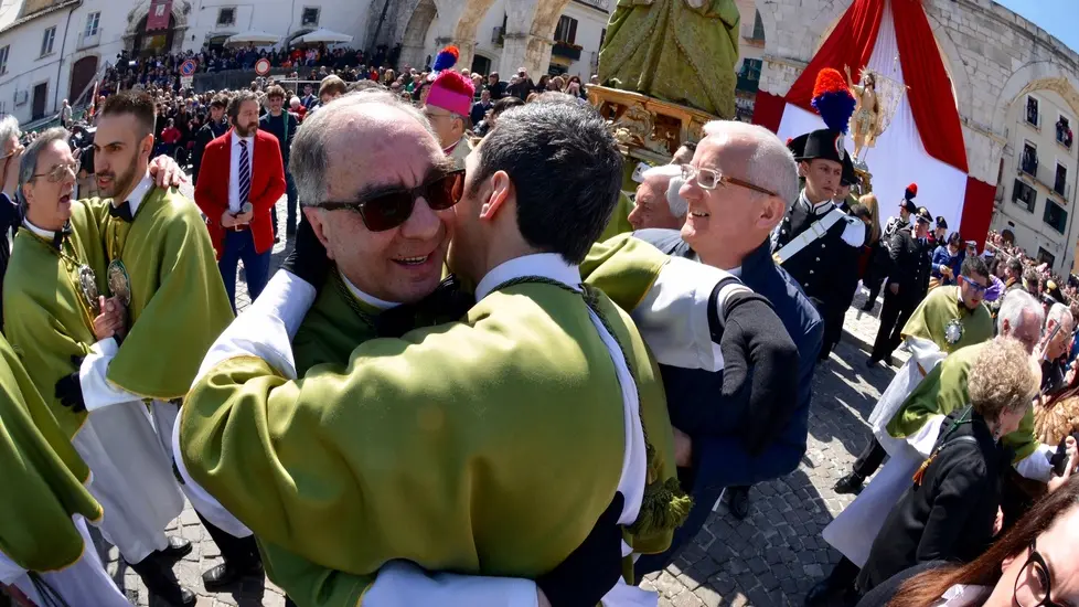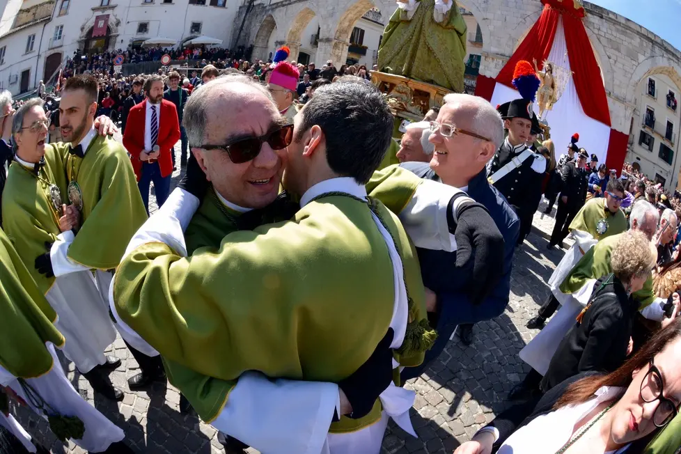 Erano da poco passate le 12 quando un lungo applauso ha accolto l’apertura del portone della chiesa di San Filippo Neri, da dove è uscita la Vergine Maria vestita a lutto, dopo l’annuncio delle resurrezione del Figlio portatole dagli apostoli Giovanni e Pietro. Segni di croce. Sguardi di preghiera. Poi il lento incedere fino al centro della piazza. La guida, Francesco De Sanctis, ha guardato la quadriglia scelta per il rito. Coordinazione, poche parole e poi il via. Protagonisti della corsa, insieme alla guida, sono stati Angelo La Civita (alla sua terza volta), Rossano Guidi (alla prima), Marco La Gatta e Giampaolo Luongo (alla seconda). Sotto l’acquedotto medievale che incornicia la piazza l’abbraccio ideale con la statua del Risorto. Il tutto scandito da lunghi e profondi attimi di commozione. Per chi ha assistito alla corsa per la prima volta, per chi non ne perde una da quando è nato. Poi il lungo abbraccio dei confratelli e la benedizione del vescovo, monsignor Angelo Spina. Un’altra bella corsa. Un’altra bella Pasqua sulmonese. Tutto è andato bene. Tradizione vuole che per la città sarà un bell’anno.