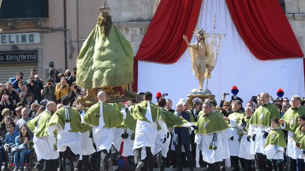 In piazza Garibaldi migliaia di persone hanno assistito alla rappresentazione dell'incontro di Maria con Gesù Risorto. La corsa perfetta, il pubblico commosso, la benedizione del vescovo Angelo Spina