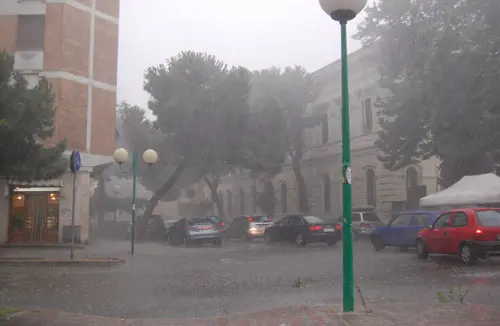 Bagnanti in costume che scappano dalle spiagge. Tuoni, fulmini e un acquazzone che si è abbattuto violentissimo sulla città intorno alle 12:30 di sabato