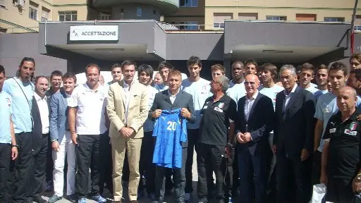L'allenatore degli azzurrini, l'ex commissario tecnico e una delegazione della squadra hanno salutato i ricoverati nei reparti di Pediatria ed Ematologia del Santo Spirito