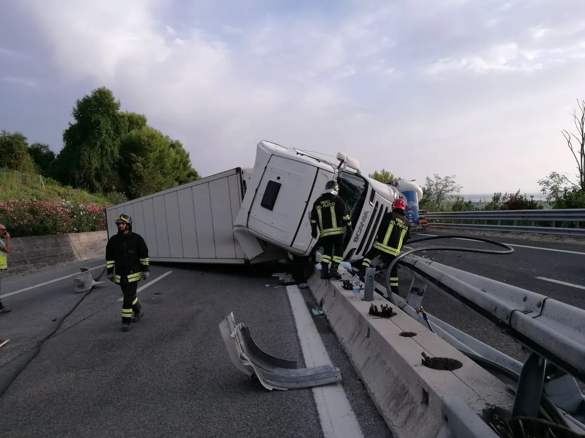 Poco fa i vigili fuoco del distaccamento di Nereto, intervenuto con l'ausilio di un'autogru, hanno provveduto a spostare il mezzo pesante sulla corsia di emergenza della carreggiata sud. L'intervento è ancora in corso: per il momento resta chiusa al traffico la corsia di sorpasso della carreggiata nord, in quanto la motrice del mezzo pesante è ancora bloccata in prossimità del new jersey, mentre è stata riaperta al traffico una sola corsia della carreggiata sud per far defluire la colonna dei mezzi bloccati dall'incidente. Al momento è prevista l'uscita obbligatoria a San Benedetto del Tronto e rientro a Val Vibrata, dato che si stanno approntando mezzi ed attrezzature per la completa rimozione dell'articolato. Sul posto rimane una squadra dei vigili del fuoco di Nereto per mettere in sicurezza il mezzo pesante che perde gasolio dal serbatoio. Sul posto sono intervenuti due squadre di vigili fuoco, una di Nereto e l'altra di San Benedetto del Tronto, personale dell'autostrada, polizia autostradale e ambulanze del 118 di San Benedetto del Tronto.