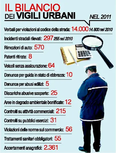 COMMERCIO. I controlli sui negozi sono stati 215, quelli sui pubblici esercizi hanno toccato la quota di 31. Dalle verifiche sono emerse 56 violazioni, tra cui due relative al testo unico di pubblica sicurezza. I controlli sul rispetto delle norme per le imprese artigiane hanno fatto scattare 16 multe. I vigili, nel 2011, hanno fatto eseguire 55 trattamenti sanitari obbligatori e hanno realizzato 2.361 accertamenti anagrafici, tra iscrizioni, cancellazioni e variazioni nei registri comunali.