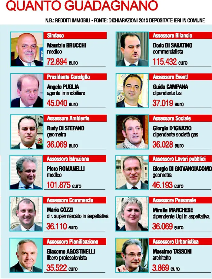 A voler stilare una classifica partendo dal più "ricco" in cima alla lista troviamo un commercialista, il vicesindaco e assessore al Bilancio Dodo Di Sabatino Martina che dichiara la fisco un reddito imponibile (cioè al netto delle ritenute previdenziali e assistenziali) di ben 115.432 euro. Lo seguono due medici, entrambi in servizio all'ospedale Mazzini, l'assessore all'Istruzione Piero Romanelli, che dichiara 101.875 euro, e il sindaco Maurizio Brucchi, senologo con un imponibile di 72.894 euro. Con 46.193 euro c'è poi l'assessore ai Lavori pubblici Giorgio Di Giovangiacomo (geometra), lo seguono il presidente del consiglio Angelo Puglia (agente immobiliare) con 45.040 euro, l'assessore agli Eventi Guido Campana (dipendente dell'Izs) con 37.019 euro e l'assessore al Commercio Mario Cozzi (direttore di supermercato in aspettativa) con 36.110 euro. Stesso imponibile di 36.069 euro per gli assessori al Personale, Mirella Marchese (dipendente Ugl in aspettativa), Rudy Di Stefano (geometra) e Giorgio D'Ignazio (dipendente società del gas). Chiudono la classifica gli ultimi due assessori entrati nella giunta, quello alla Pianificazione strategica Giacomo Agostinelli (libero professionista) con 35.522 euro e quello all'Urbanistica Massimo Tassoni, architetto con un imponibile di 3.869 euro.