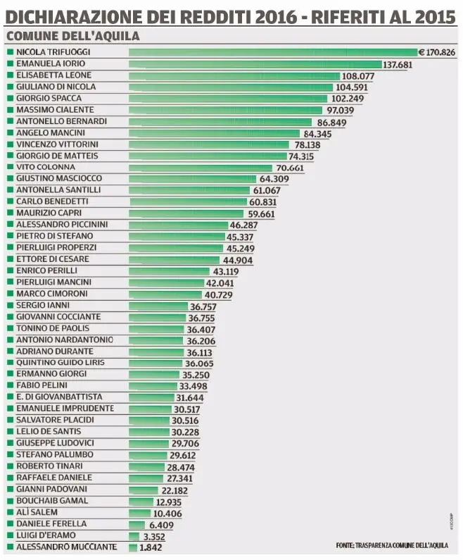 Scendendo dall’Olimpo degli “over centomila”, c’è proprio Cialente, che ha guadagnato “solo” 97.039 euro, contro i precedenti 122mila. Continuando a scorrere la classifica spuntano Antonello Bernardi, medico, con 86.8449 euro (contro i precedenti 79.366); Angelo Mancini, dirigente scolastico, con 84.345 euro, Vincenzo Vittorini (medico), con 78.138 euro, Giorgio De Matteis (medico anche lui, con 74.315 euro), Vito Colonna, 70.661; Giustino Masciocco (64.309), Antonella Santilli (medico, 61.067 euro, contro i precedenti 74.433). A scendere si posizionano il presidente del consiglio comunale, Carlo Benedetti, avvocato, con 60.831 euro, l’assessore Maurizio Capri, avvocato, con 59.661 euro (contro i 49.086 del 2015), il consigliere Alessandro Piccinini (46.287 euro), l’assessore Pietro Di Stefano (45.337 euro), il consigliere Pierluigi Properzi (45.249), il consigliere Ettore Di Cesare (44.904, contro i 14.977 del 2015), il consigliere Enrico Perilli (43.119), l’assessore Pierluigi Mancini con 42.041 euro, il consigliere Marco Cimoroni (40.729), l’assessore Giovanni Cocciante (36.775 euro), i consiglieri Sergio Ianni (36.757), Tonino De Paolis (36.407), Antonio Nardantonio (36.206), Adriano Durante (36.113), Guido Liris (36.065), Ermanno Giorgi (35.250 euro), l’assessore Fabio Pelini (33.498). Intorno ai trentamila euro troviamo l’assessore Emanuela Di Giovambattista (31.644), i consiglieri Emanuele Imprudente, Salvatore Placidi, e l’ex assessore Lelio De Santis.