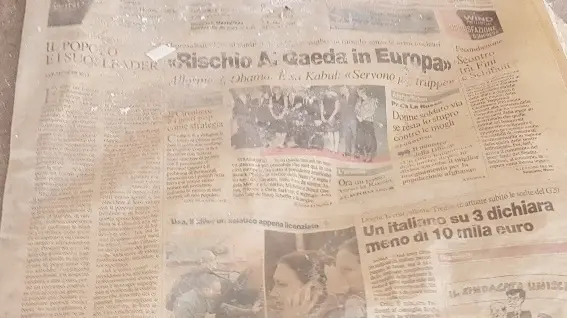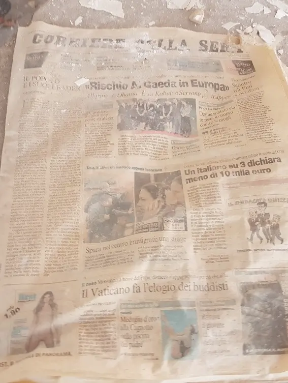 Tra blocchi di cemento delle scalinate crollate e calcinacci una copia del Corriere della Sera di sabato 4 Aprile 2009
