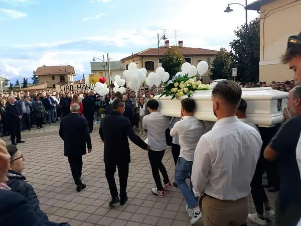 La bara portata a spalla dagli amici e i palloncini liberati al cielo. Un migliaio ai funerali. Le parole del parroco: «Prima o poi ci riabbracceremo»